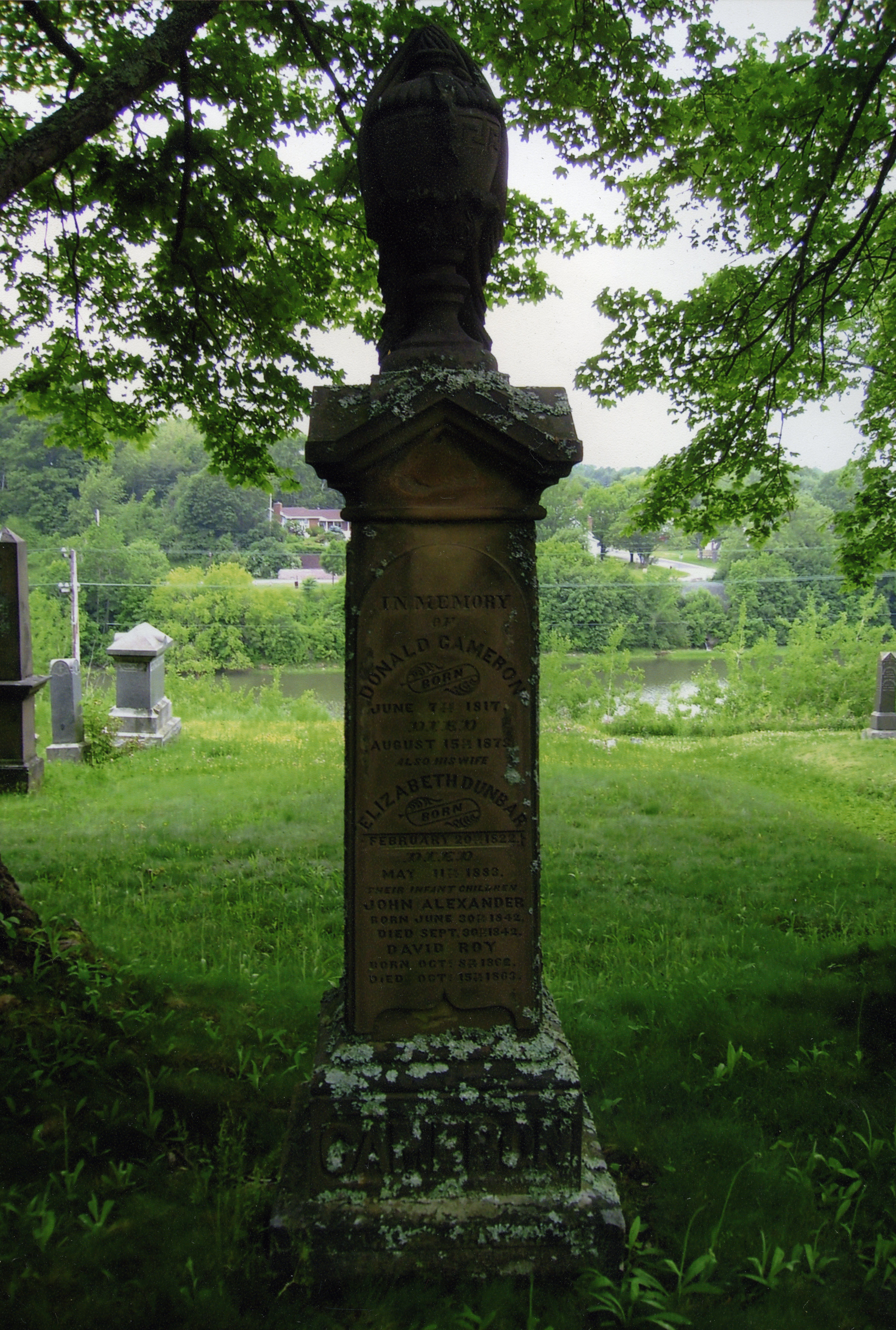 The gravestone of Donald Cameron and his wife Elizabeth (née Dunbar) Cameron and their infant children is located in New Glasgow Riverside Cemetery (PN01 in the Ritchie Cemetery Listings).