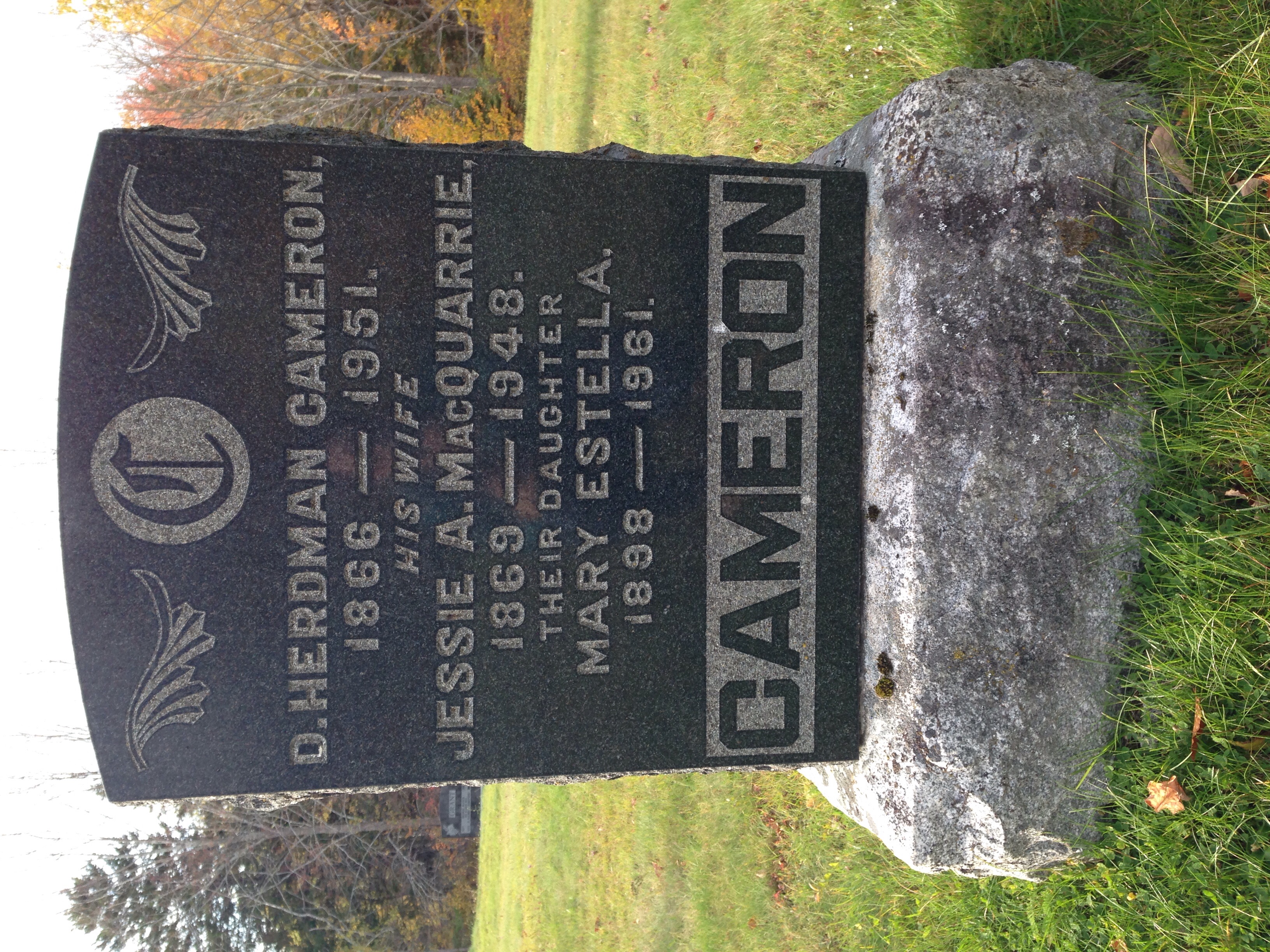 Headstone - D. Herdman Cameron (1866 - 1951), his wife Jessie Amelia MacQuarrie (1869 - 1948), and their daughter Mary Estella Cameron (1898 -1961) at Scotch Hill Cemetery near Pictou, Nova Scotia.
