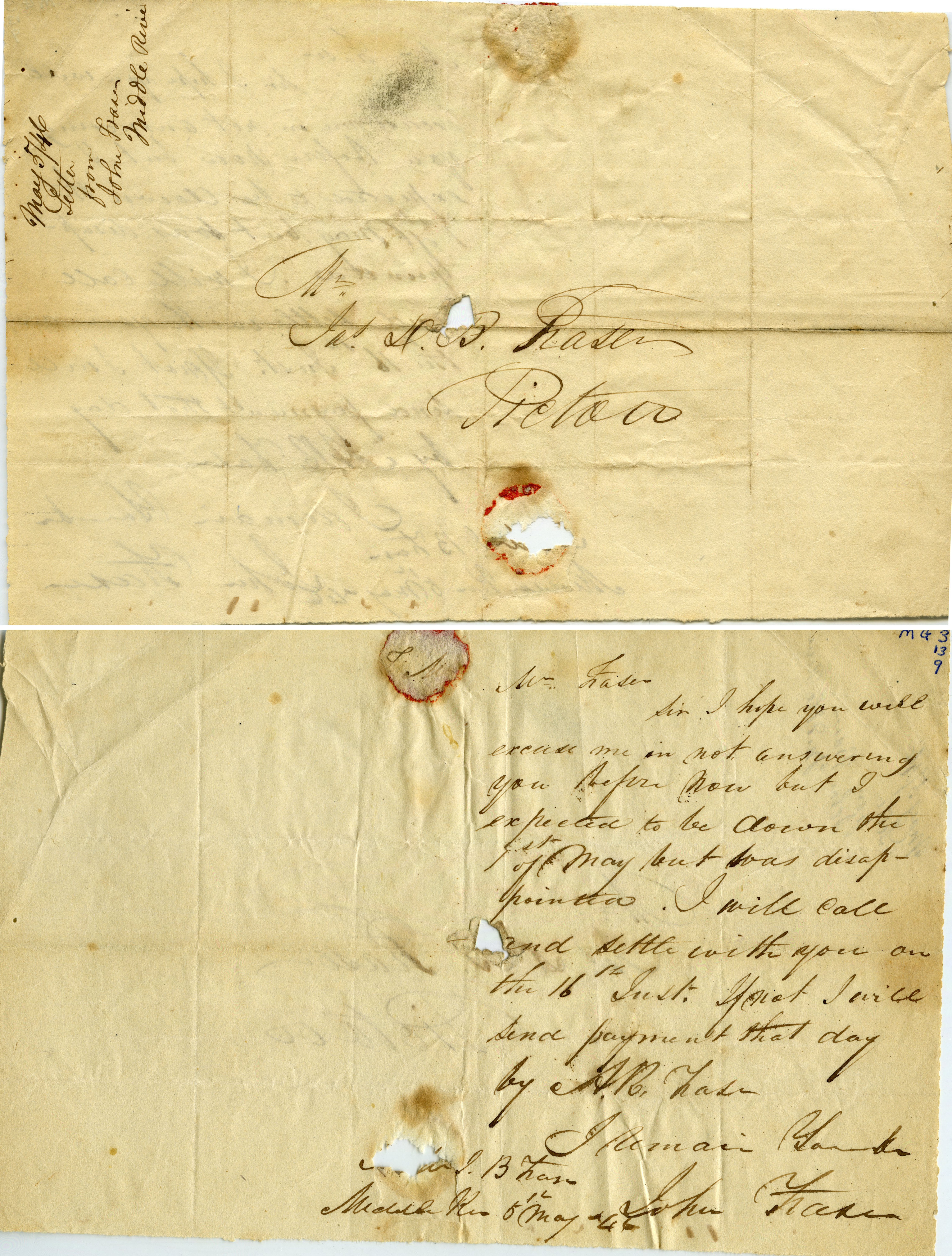 Sir I hope you will excuse me in not answering you before now but I expected to be down the 1st of May but was disappointed. I will call and settle with you on the 16th Inst. If not I will send payment that day by A R Fraser.