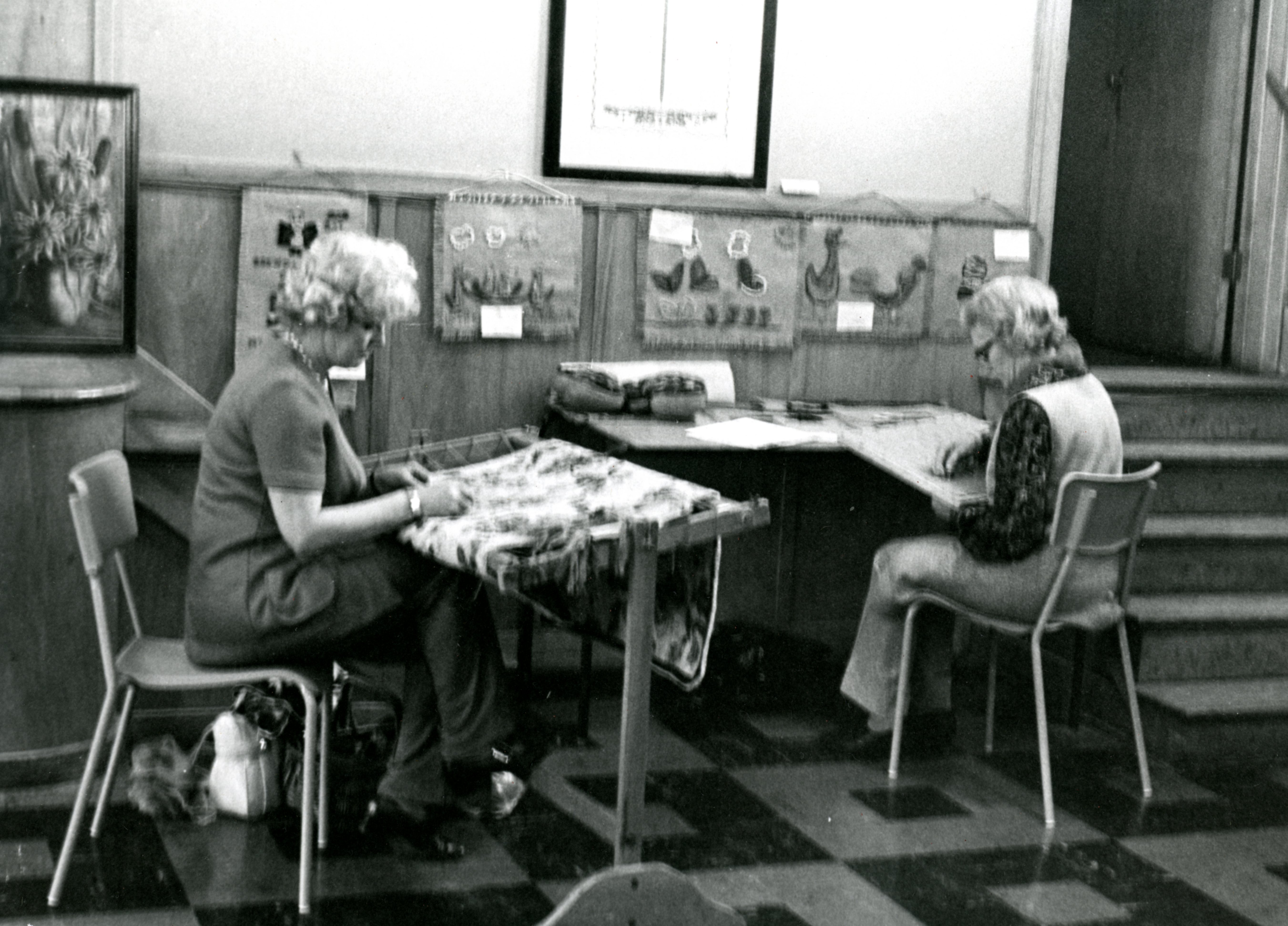 "Photo is of Sylvia MacDonald and Gertrude Beattie rughooking about 1969 (?) in New Glasgow"