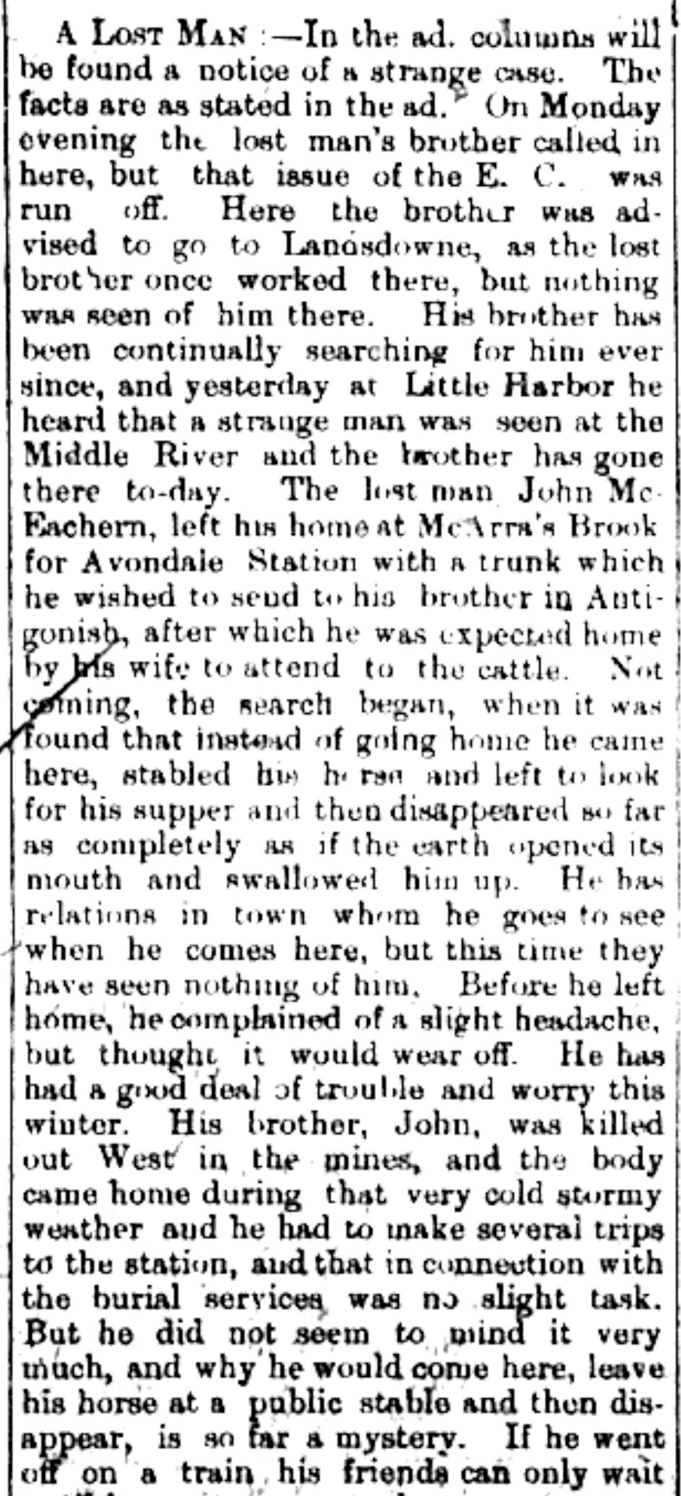 A Lost Man: - In the ad. columns will be found a notice of a strange case. The facts are as stated in the ad. On Monday evening the lost man's brother called in here, but that issue of the E.C. was run off. Here the brother was advised to go to Landsdowne, as the lost brother once worked there, but nothing was seen of him there. His brother has been continually searching for him ever since, and yesterday at Little Harbor he heard that a strange man was seen at the Middle River and the brother has gone there to-day. The lost man John McEachern, left his home at McArra's Brook for Avondale Station with a trunk which he wished to send to his brother in Antigonish, after which he was expected home by his wife to attend to the cattle. Not coming, the search began, when it was found that instead of going home he came here, stabled his horse and left to look for supper and then disappeared so far as completely as if the earth opened its mouth and swallowed him up. He has relations in town whom he goes to see when he comes here, but this time they have seen nothing of him. Before he left home, he complained of a slight headache, but thought it would wear off. He has had a good deal of trouble and worry this winter. His brother John, was killed out West in the mines, and the body came home during that very cold stormy weather and he had to make several trips to the station, and that in connection with the burial services was no slight task. But he did not seem to mind it very much, and why he would come here, leave his horse at a public stable and then disappear, is so far a mystery. If he went off on a train, his friends can only wait