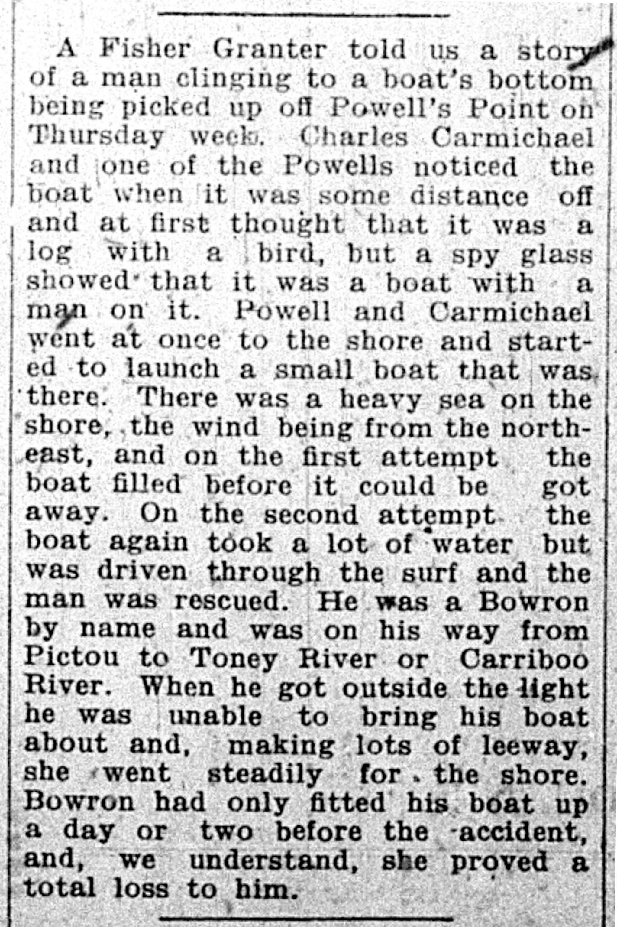 A Bowron man was rescued off Powell's Point by Charles Carmichael and a Powell.