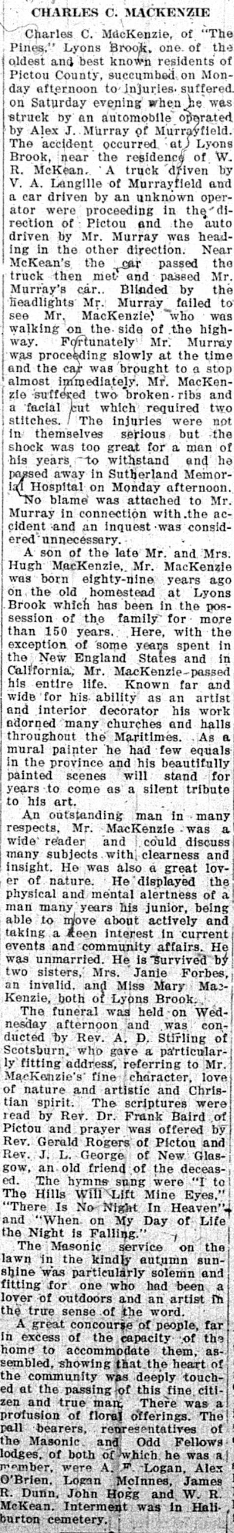 Charles C MacKenzie, of "The Pines," Lyons Brook, one of the oldest and best known residents of Pictou County succumbed on Monday afternoon to injuries suffered on Saturday evening when he was struck by an automobile operated by Alex J Murray of Murrayfield. The accident occurred at Lyons Brook, near the residence of W R McKean. A truck driven by V A Langille of Murrayfield and a car driven by an unknown operator were proceeding in the direction of Pictou and the auto driven by Mr Murray was heading in the other direction. Near McKean's the car passed the truck then met and passed Mr Murray's car. Blinded by the headlights Mr Murray failed to see Mr MacKenzie, who was walking on the side of the highway. Fortunately Mr Murray was proceeding slowly at the time and the car was brought to a stop almost immediately. Mr MacKenzie suffered two broken ribs and a facial cut which required two stitches. The injuries were not in themselves serious but the shock was too great for a man of his years to withstand and he passed away in Sutherland Memorial Hospital on Monday afternoon.