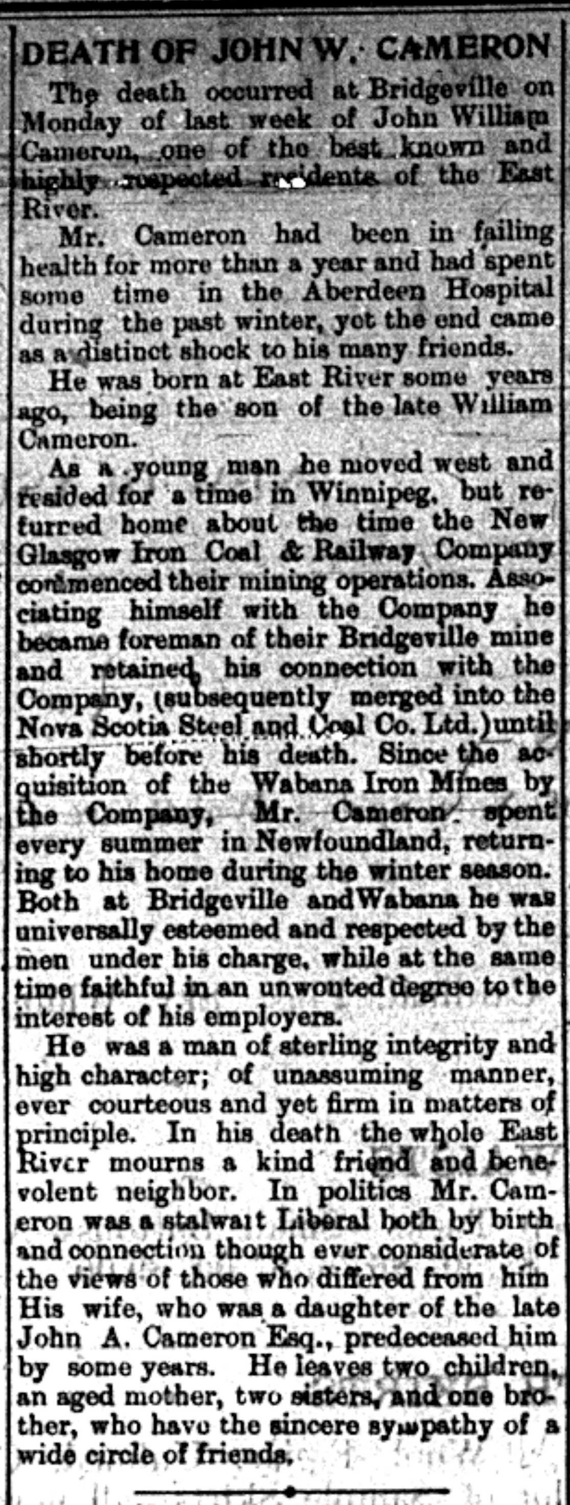 As a young man he moved west and resided for a time in Winnipeg, but returned home about the time the New Glasgow Iron Coal & Railway Company commenced their mining operations. Associating himself with the Company he became foreman of their Bridgeville mine and retained his connection with the Company, (subsequently merged into the Nova Scotia Steel and Coal Co Ltd) until shortly before his death. Since the acquisition of the Wabana Iron Mines by the Company, Mr Cameron spent every summer in Newfoundland, returning to his home during the winter season. Both at Bridgeville and Wabana he was universally esteemed and respected by the men under his charge, while at the same time faithful in an unwonted degree to the interest of his employers.
