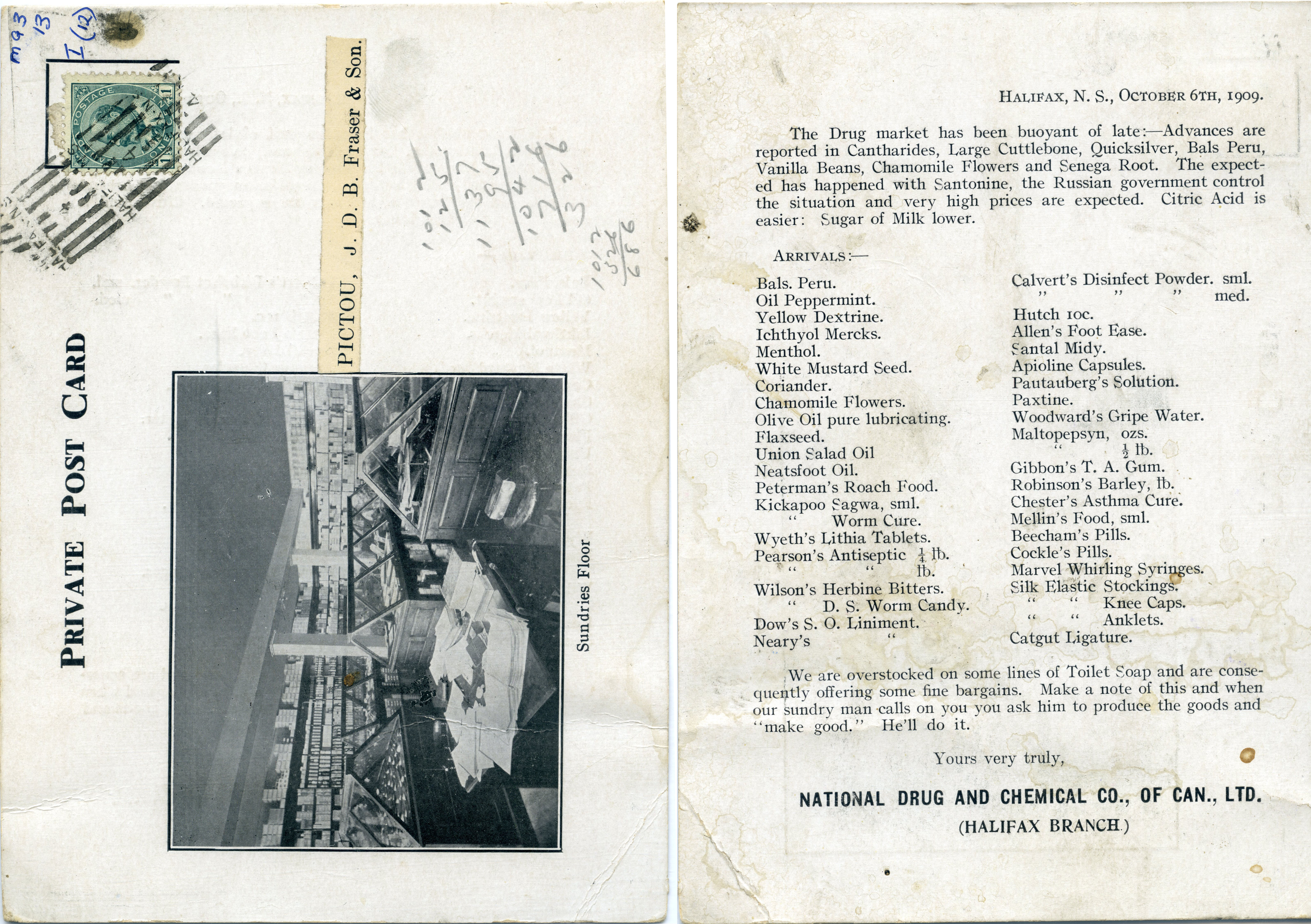 Postcard with photo of the sundries floor of J D B Fraser & Sons as well as a list of pills, ointments, seeds, powders, etc. found in store. Presented by the National Drug and Chemical Company of Canada Limited and dated Halifax, NS, October 6th, 1909.