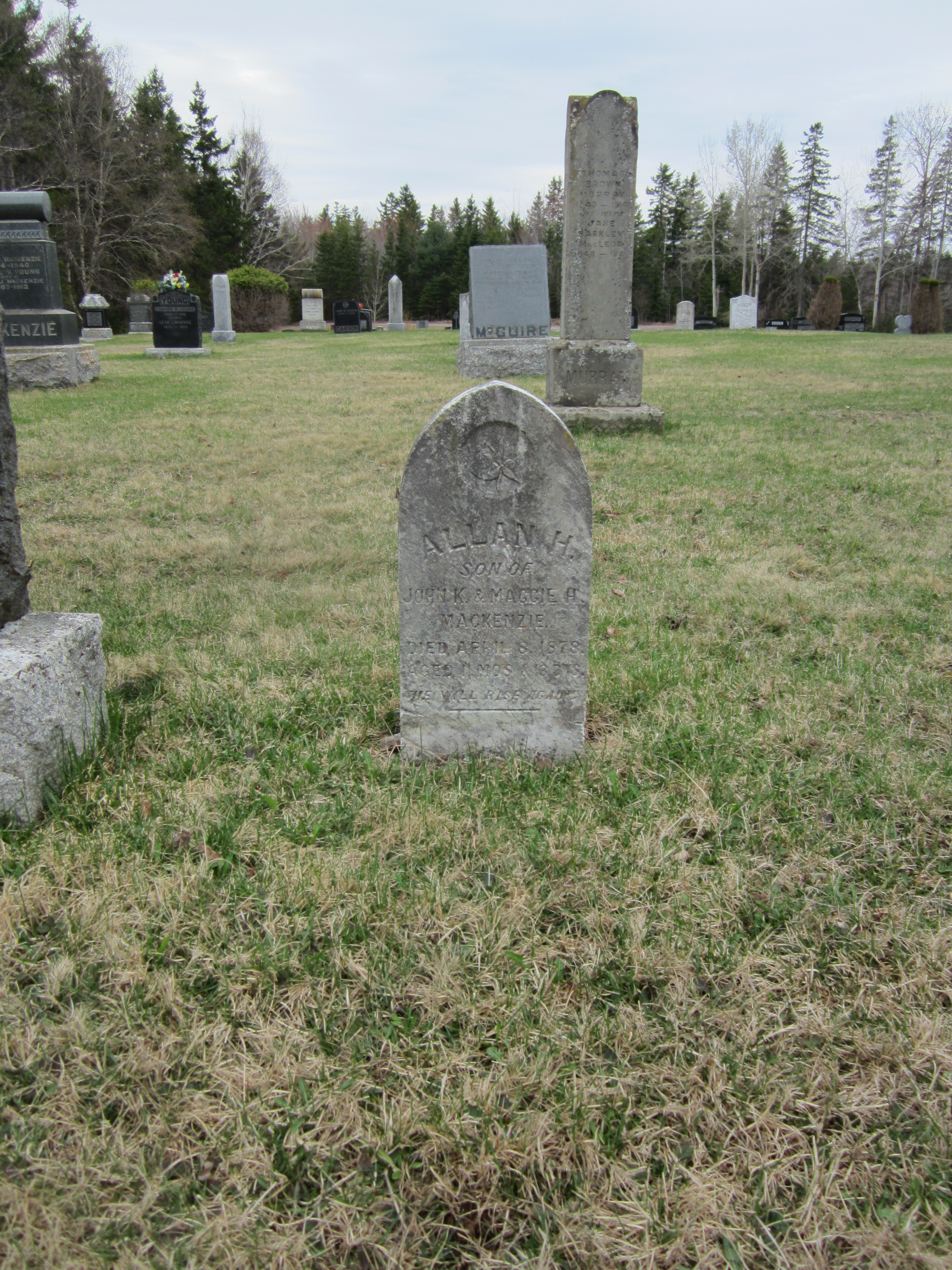 ALLEN H. SON OF JOHN K AND MAGGIE H. MACKENZIE DIED APRIL 8TH 1878 DIED 11 MO'S 18 DAYS, HE SHALL RISE AGAIN