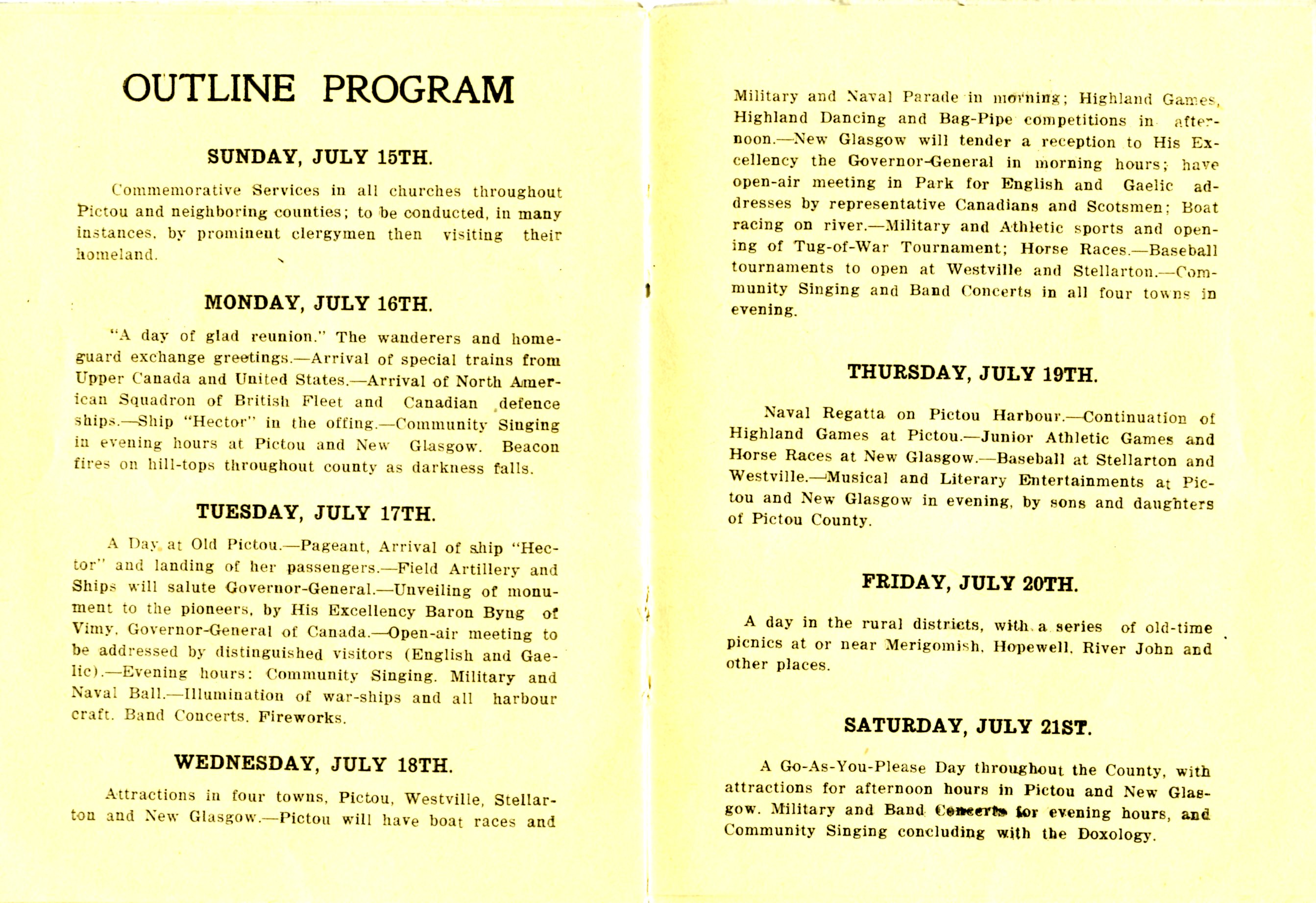 Outline for the program for the 150th Anniversary of the Ship Hector. Features the events that are to ocur to celebrate the Ship Hector.