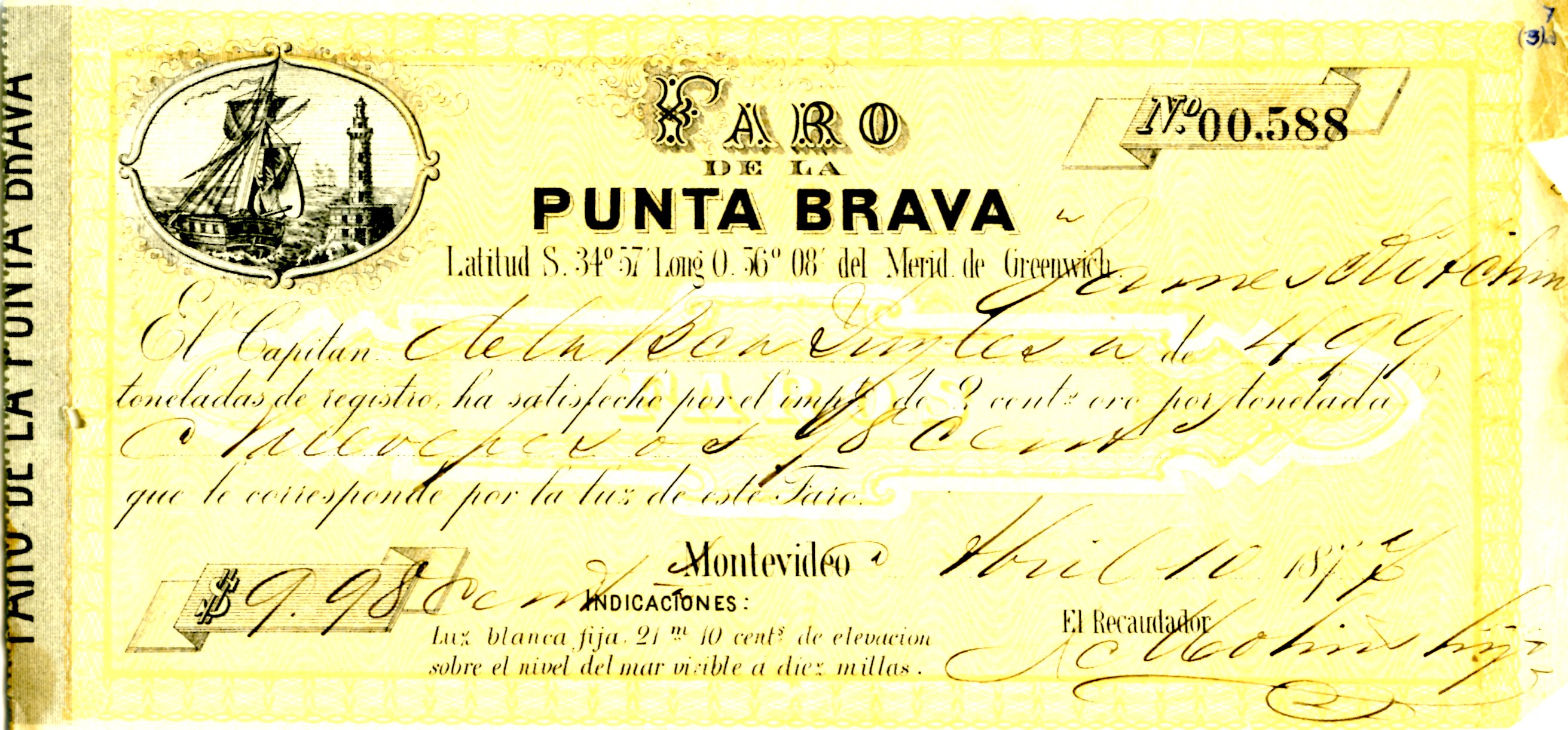 The Captain of the Barque Ying (?), James Kitchin, which is registed to haul 499 tons, has satisfied the tax of 2 centimos (cents)of gold by ton (reference to currency, not ships) of nine dollars (pesos) and 18 centimos (cents), that corresponds with the tax of this lighthouse.