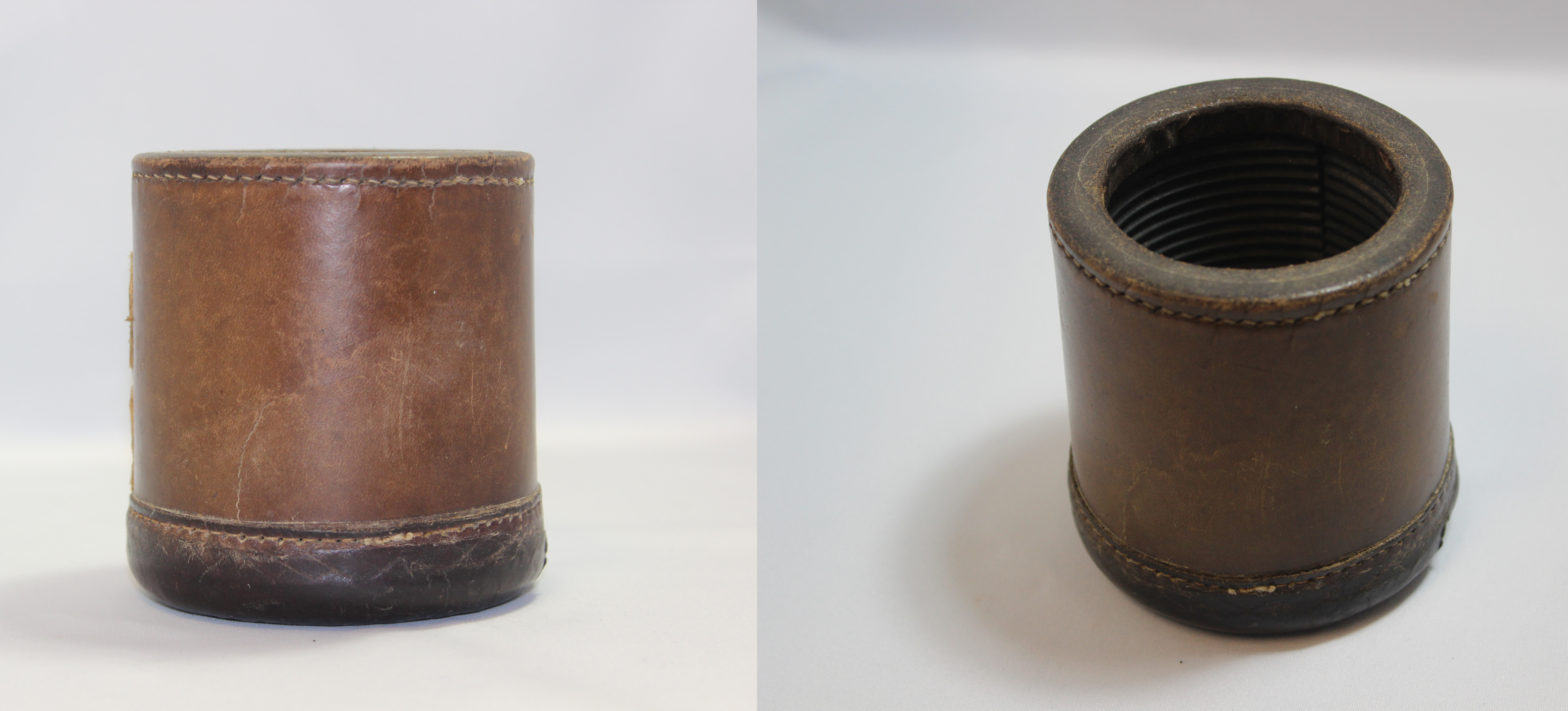 Brown leather cup from Twitter diplay, possibly used for rolling dice?