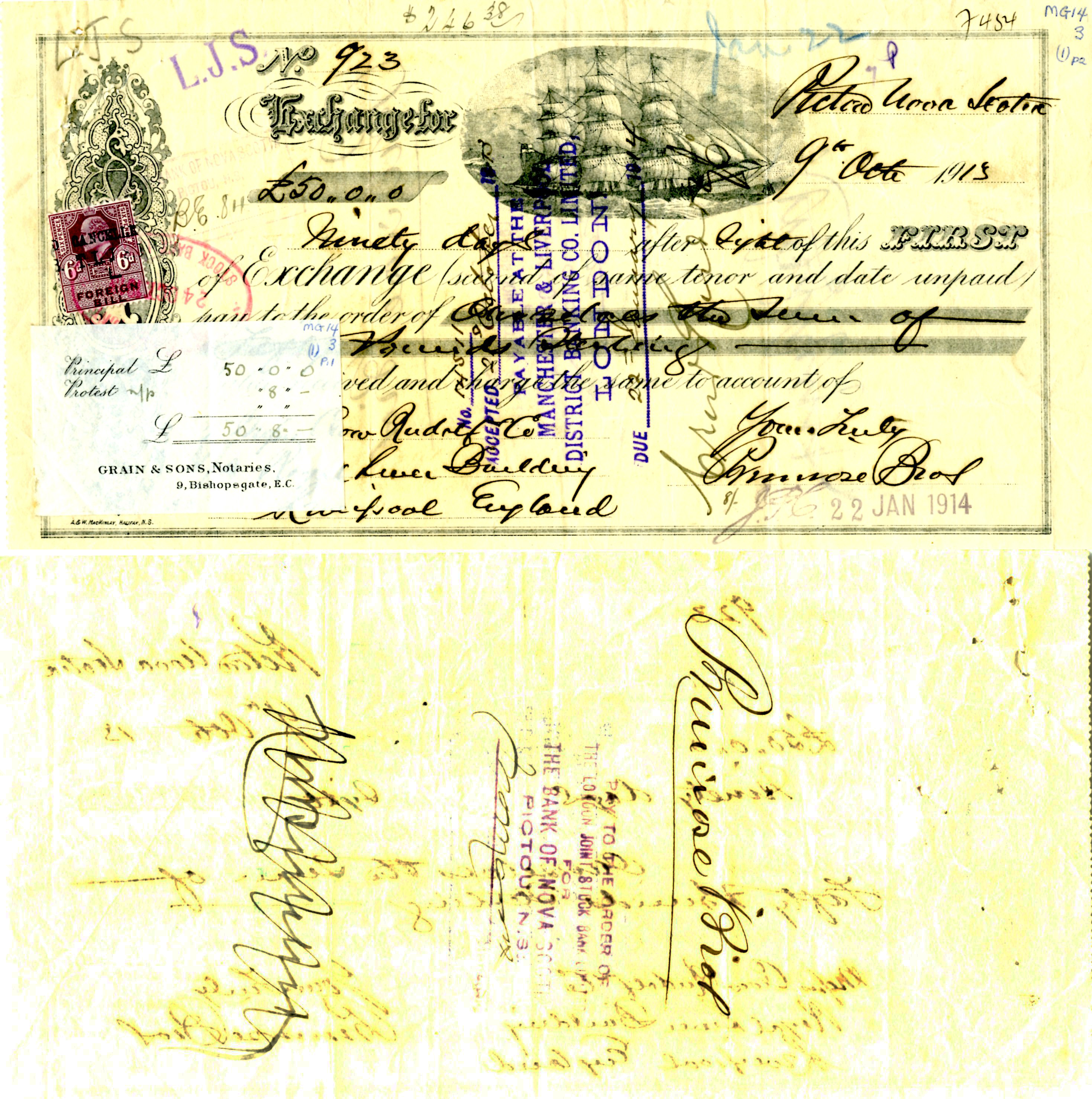 Indorsed: - Primrose Bros. Pay to the order of The London Joint Stock Bank Limited for the Bank of Nova Scotia. Pictou. N.S. J. Moman, Manager. Per Pro. of the London Joint Stock Bank Limited. C.N. Butcher, Chief Cashier."
