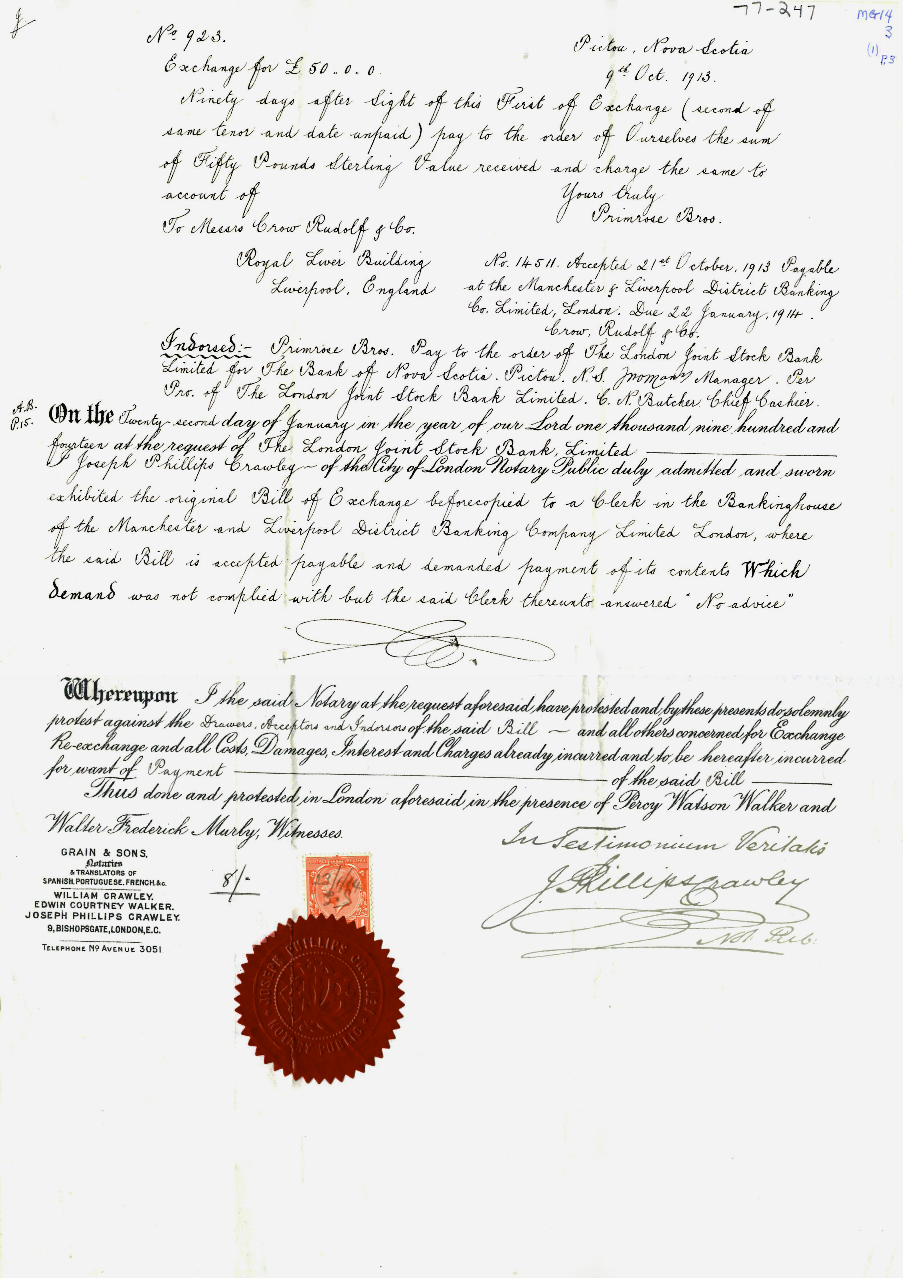 Indorsed: - Primrose Bros. Pay to the order of The London Joint Stock Bank Limited for the Bank of Nova Scotia. Pictou. N.S. J. Moman, Manager. Per Pro. of the London Joint Stock Bank Limited. C.N. Butcher, Chief Cashier."