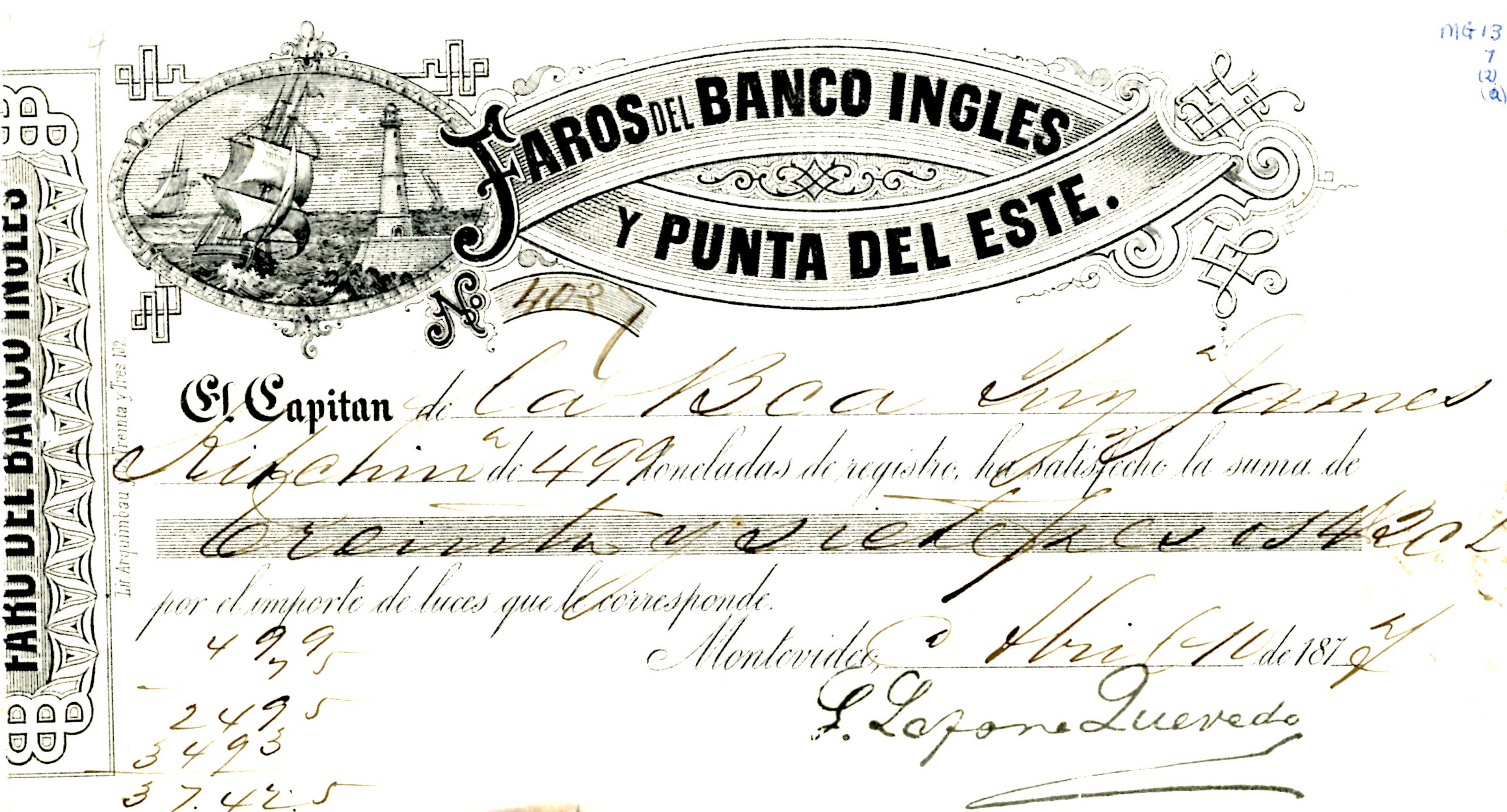 This is a receipt issued to the James Kitchin upon arriving at the port. Gathering from what it says (in Spanish, and roughly translated below in English), it was most likely a taxation imposed on the ship in order to help pay for the construction costs for the lighthouse in Montevideo (capital of Uruguay). David J. Kitchin was the master of the ship.