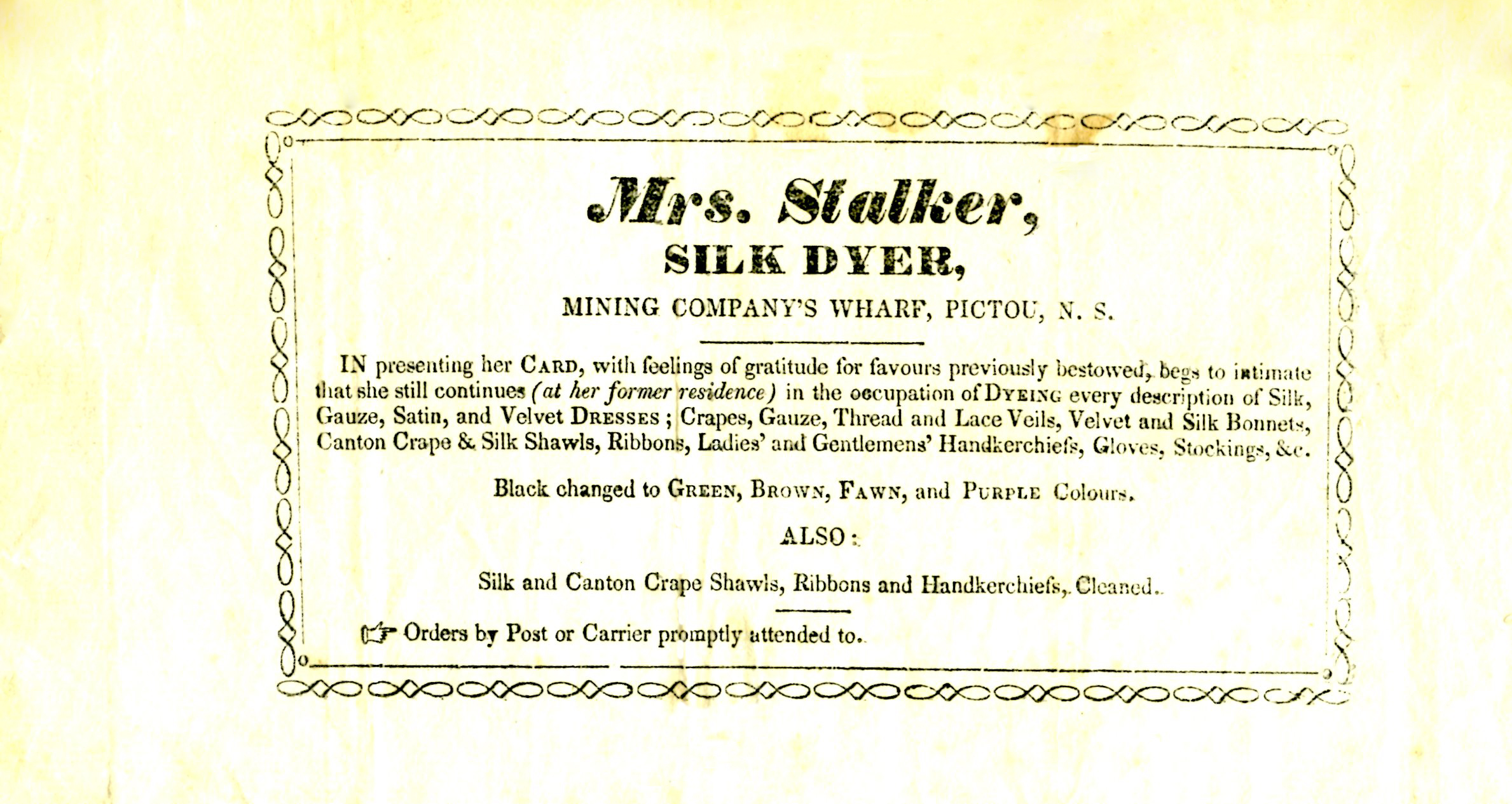 "Mrs. Stalker, Silk Dyer, Mining Company's Wharf, Pictou, N.S.