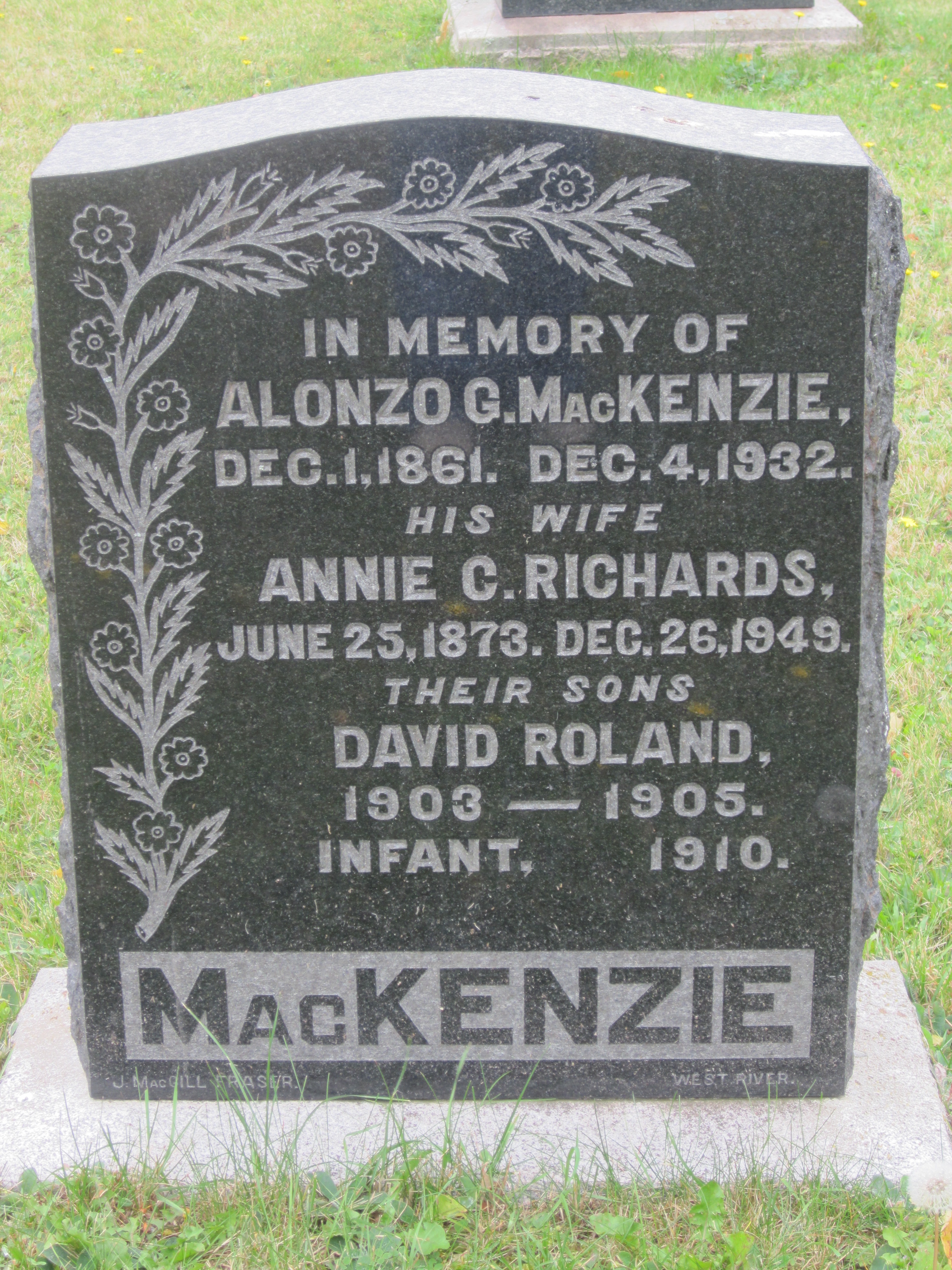 IN MEMORY OF ALONZO G. MacKENZIE DEC. 1. 1861 DEC.4.1932 HIS WIFE ANNIE C. RICHARDS JUNE 25, 1873 DEC.26, 1949 THIER SONS DAVID ROWLAND 1903 - 1905 INFANT 1910.