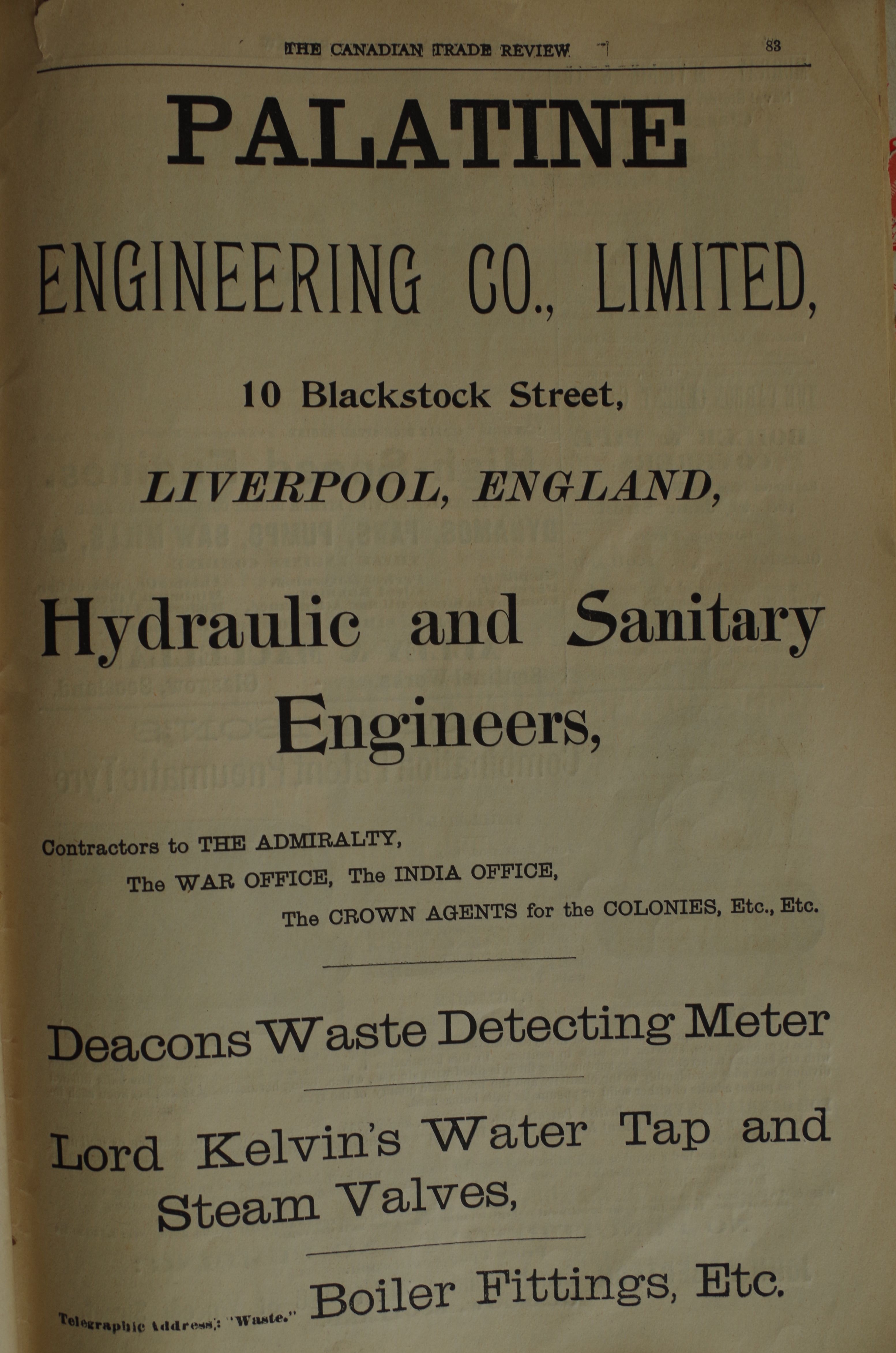 This page features and advertisement for the Palatine Engineering Co., Ltd., hydraulic and sanitary engineers