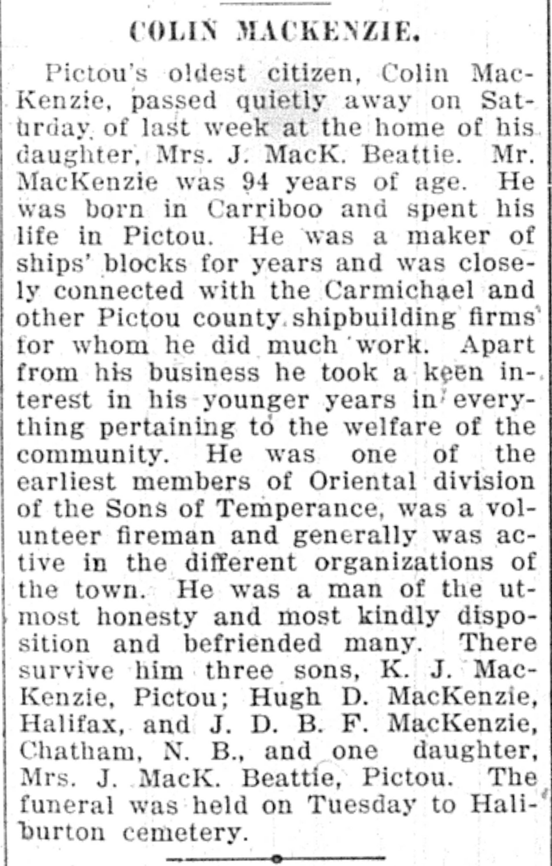| Tags: | Colin MacKenzie, Pictou, 1916, obituary, Carriboo, Caribou, Carmichael, ship builder, Mrs J MacKenzie Beattie, K J MacKenzie, Halifax, J D B F MacKenzie, Chatham New Brunswick |