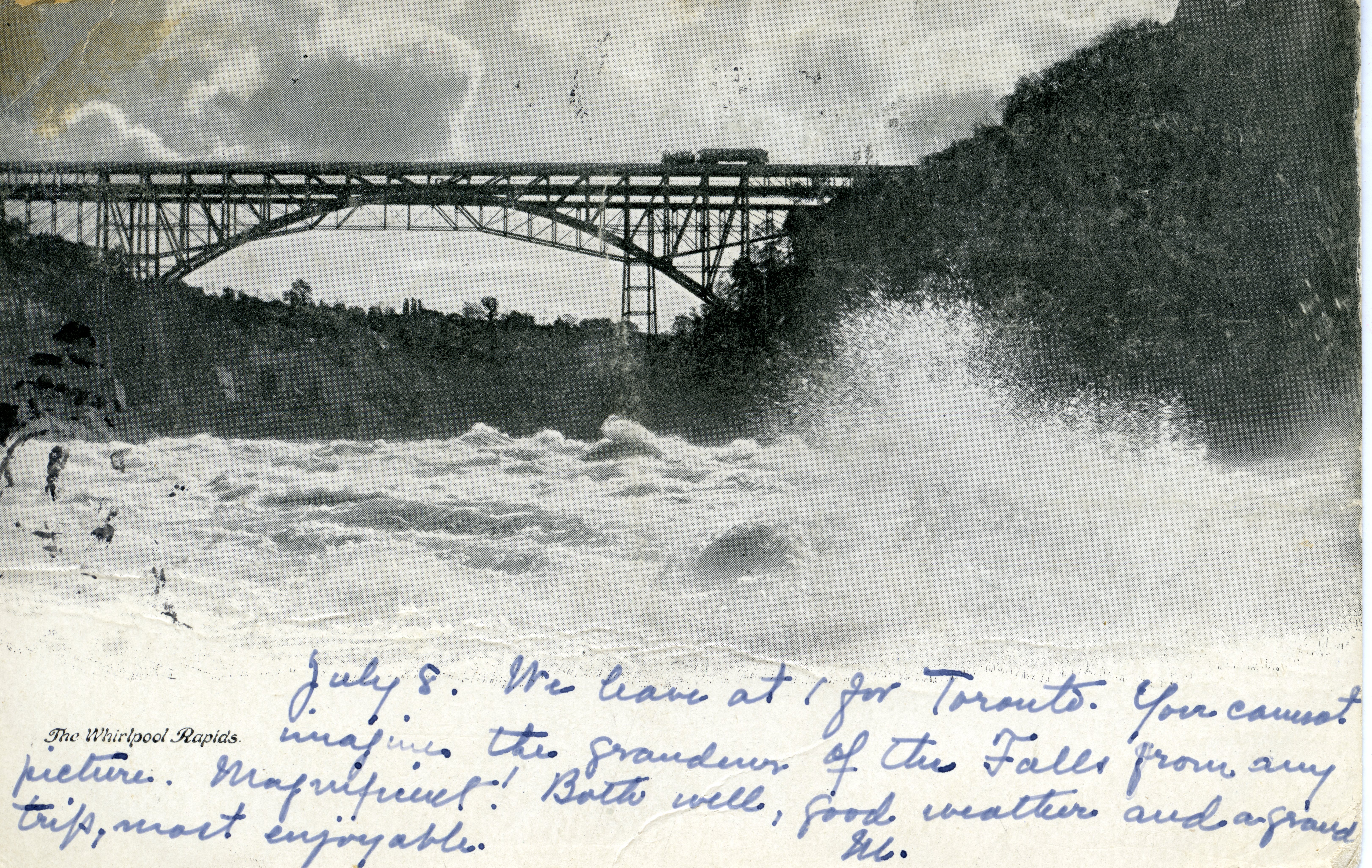 July 8. We leave at 1 for Toronto. You cannot imagine the grandeur of the Falls from any picture. Magnificent! Both well, good weather and a grand trip, most enjoyable.