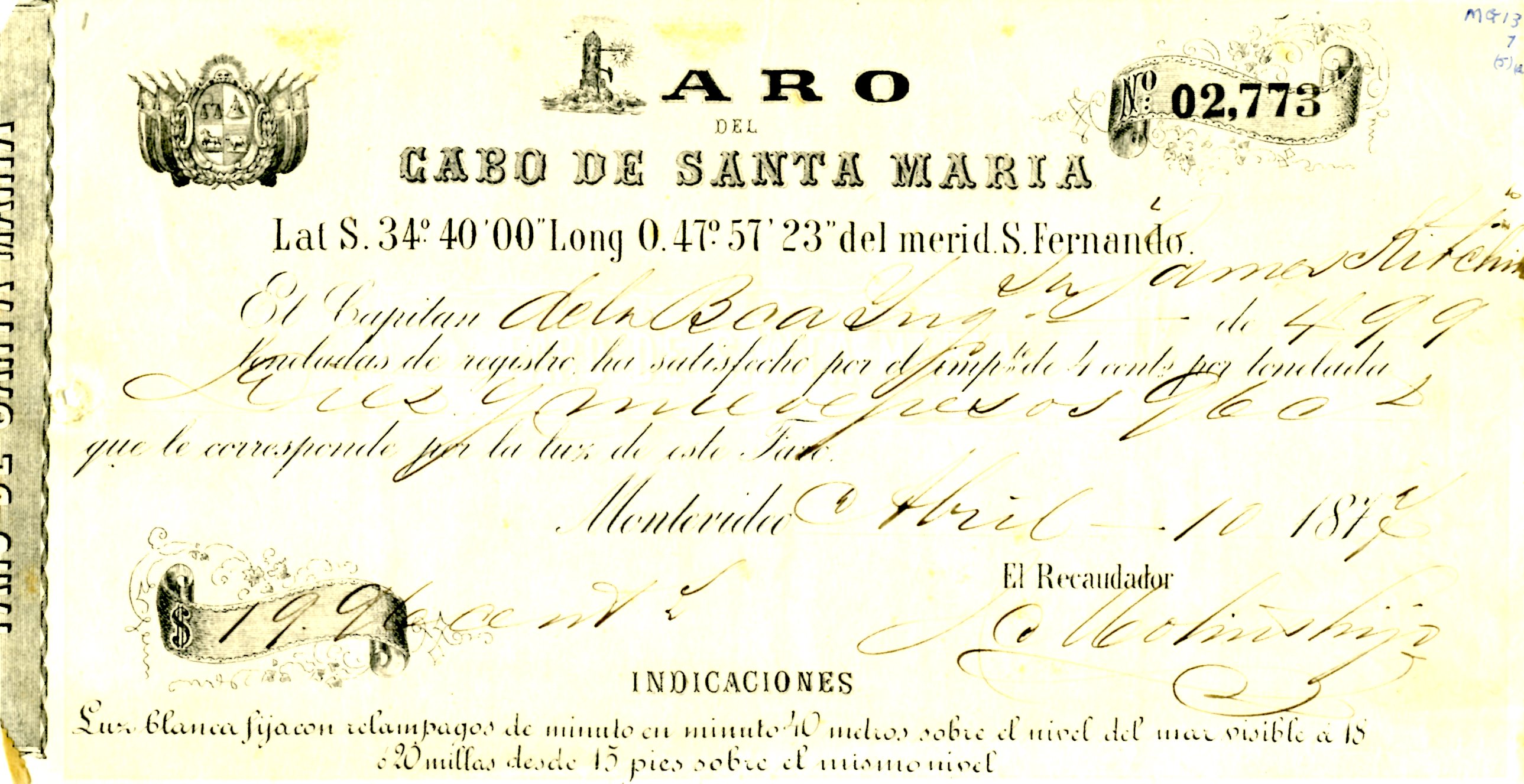 El Capitan del Bca (Bacca) Ying (?) James Kitchin de 499 tonladas de register ha satisfeche por el impuesto de 4 centimos por tonelada que le corresponde por la lux de este Faro.