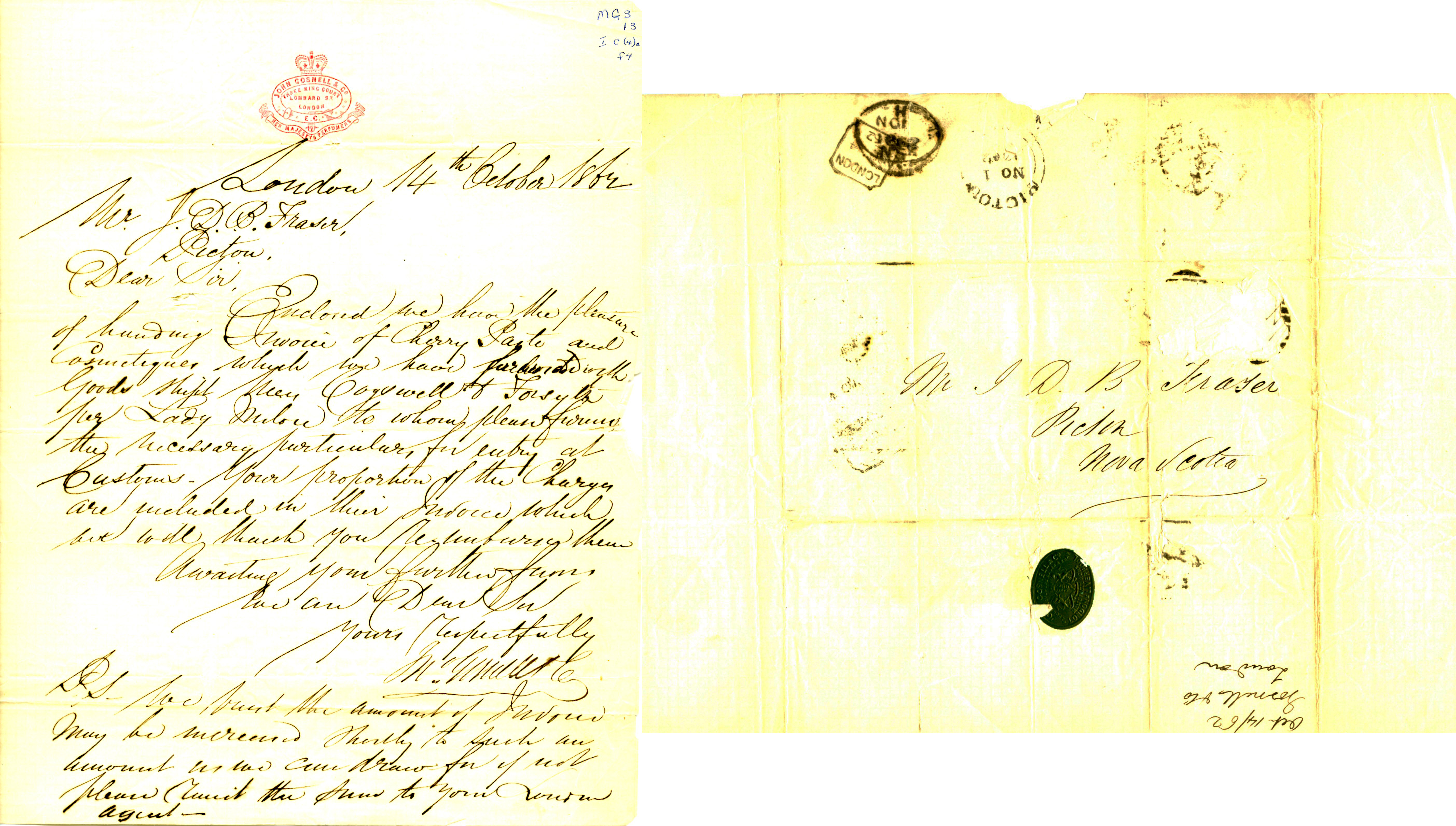 The letter is dated London, 14th October 1864. In it, the writer explains to J.D.B. Fraser that inclosed is the invoice from which a portion of his pay will be derived from once the patron pays the sum.