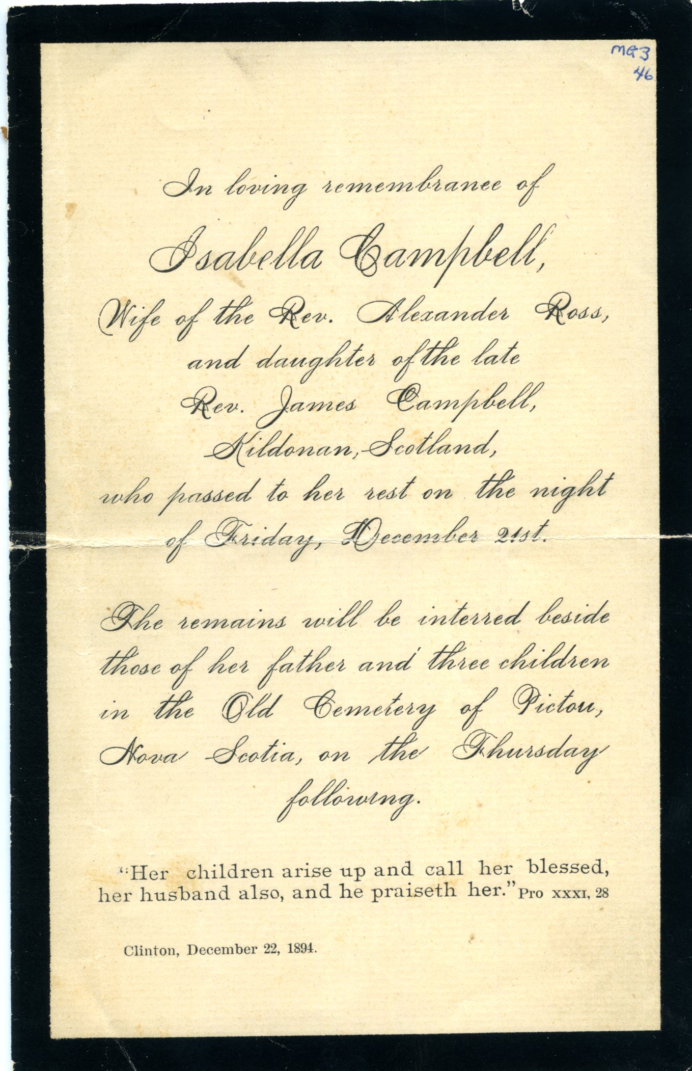 In loving remembrance of Isabella Campbell, wife of the Rev. Alexander Ross, and daughter of the late Rev. James Campbell, Kildonan, Scotland, who passed to her rest on the night of Friday, December 21st.
