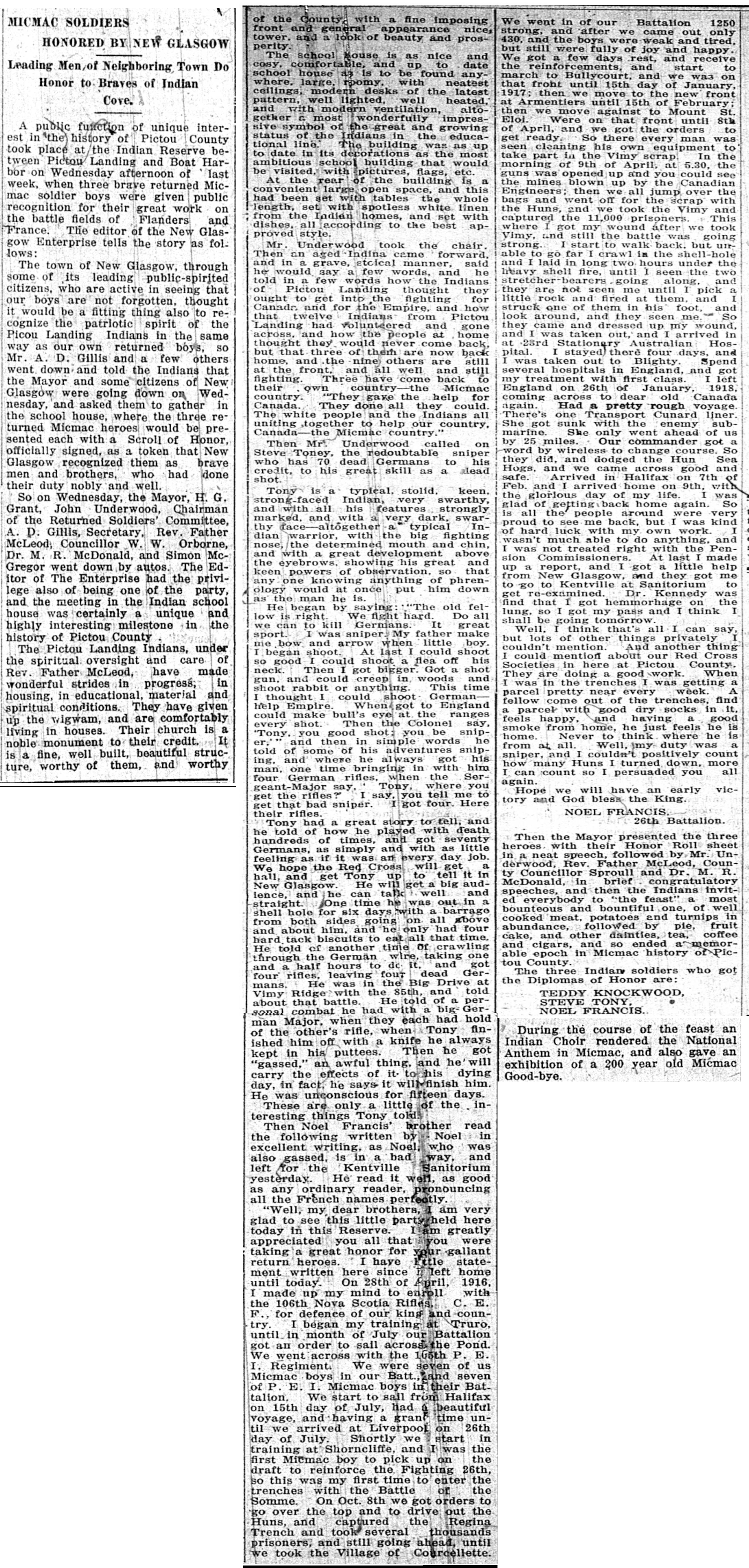 | Tags: | Stephen Toney, Pictou Landing, Boat Harbour, First Nations, France, Flanders, Vimy Ridge, Noel Francis, 106th Nova Scotia Rifles, Teddy Knockwood, 26th Battalion, Mi'kmaq, Steve Toney |