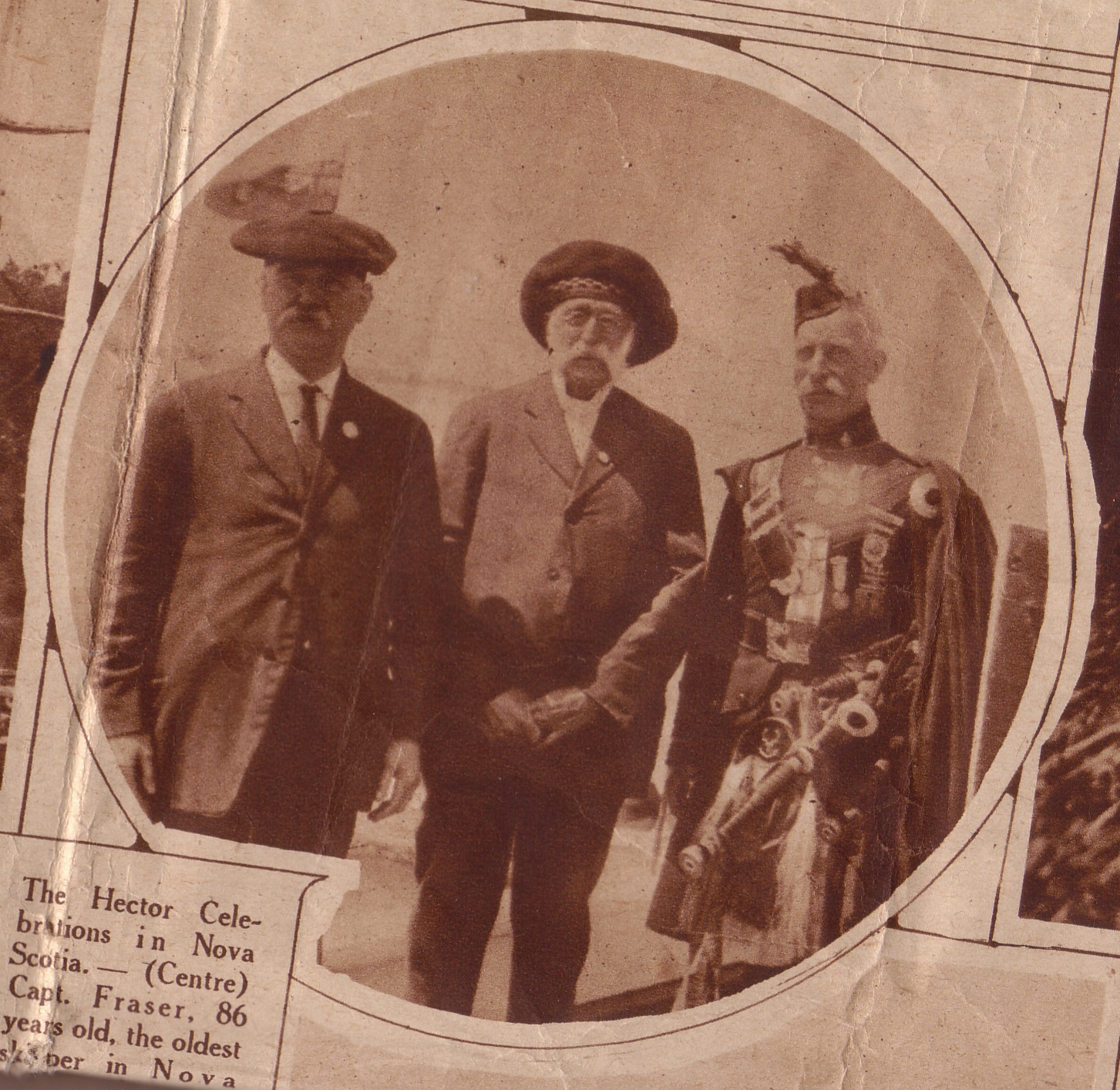 "The Hector Celebrations in Nova Scotia - (centre) Capt. Fraser, 86 years old, the oldest skipper in Nova Scotia, who acter as skipper of the Hector (left) Capt. James Meikle, who acted as mate; and (right) the piper who played the Hector into Pictou harbor."