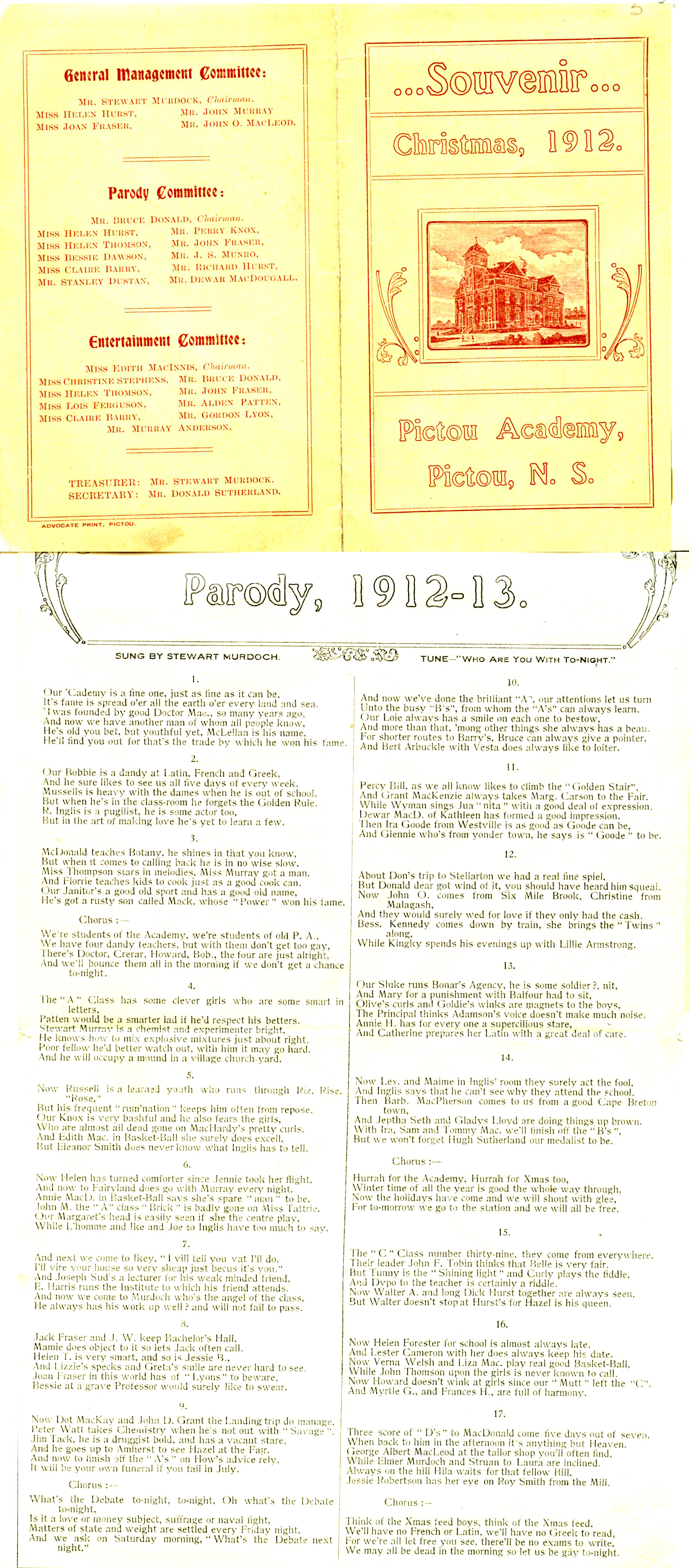 The Parody for the 1912-1913 school year was sung by Stewart Murdoch to the tune of "Who are You with To-night."