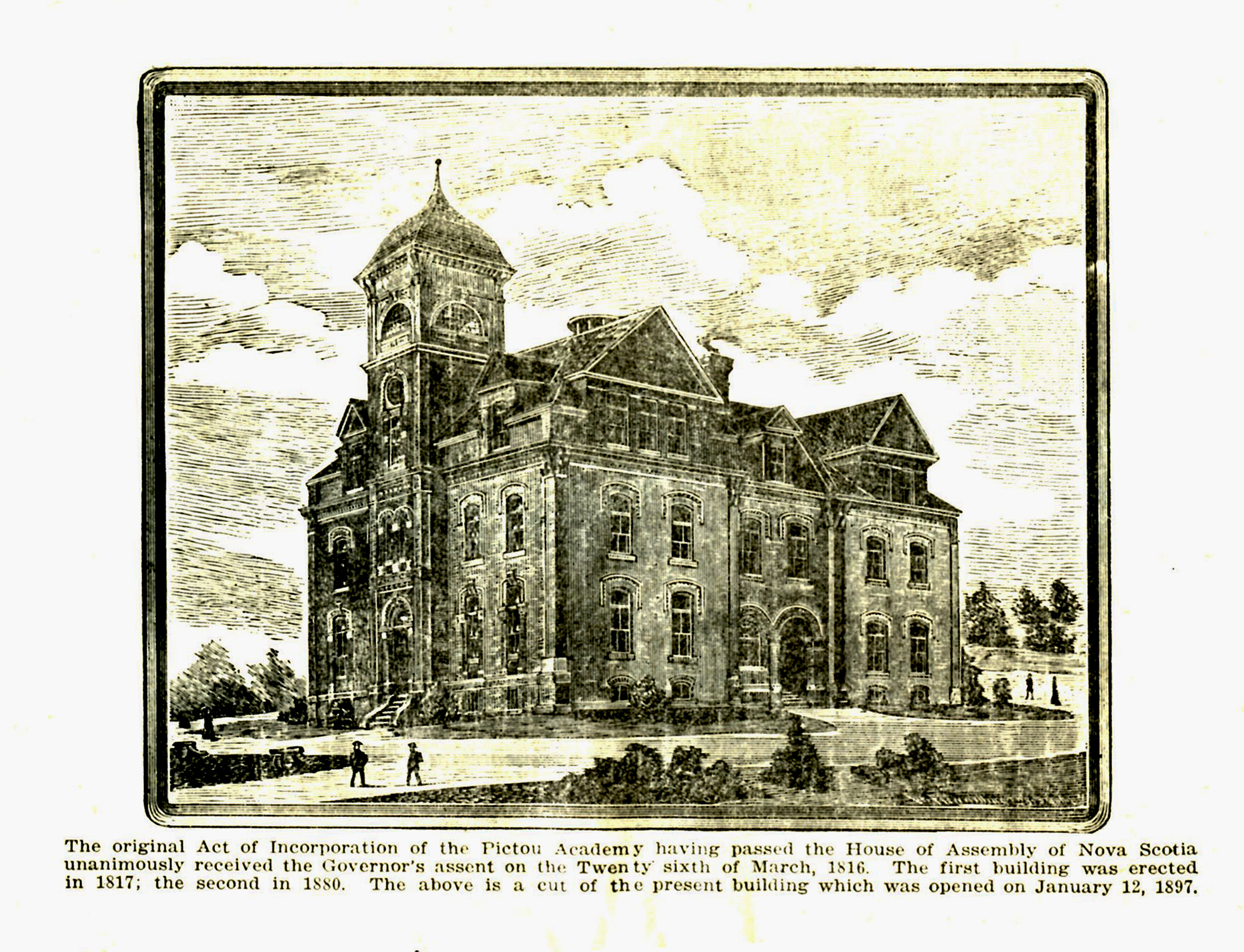 The drawing is of the third Pictou Academy building, which was opened in 1897. The drawing itself was included in the 1932-1933 Course of Study (Academic Calendar) for the Academy.