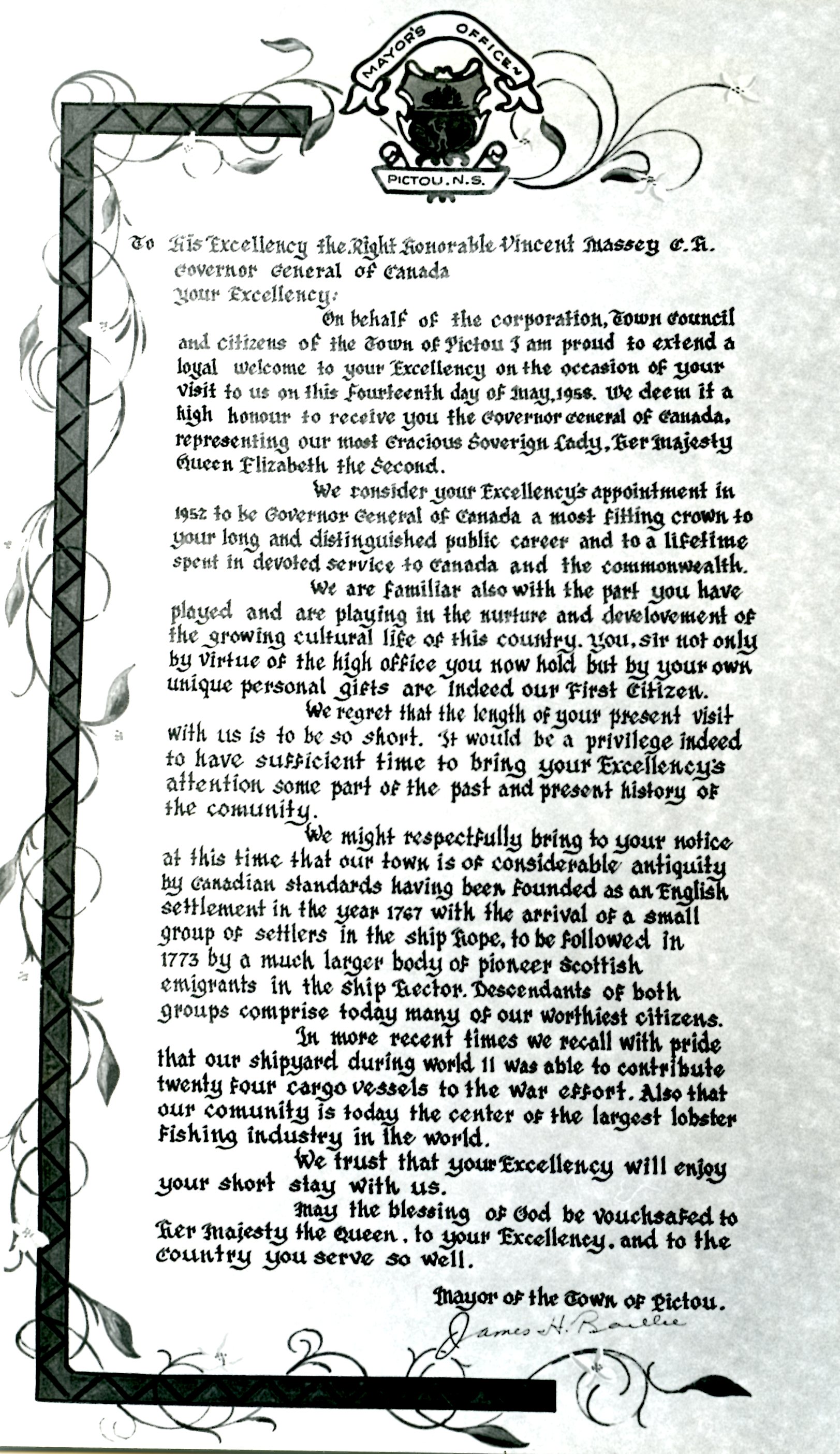 Scroll given to Gov. Gen. Vincent Massey when visiting Pictou in 1958 (given by town). Artist was James DeCoste.
