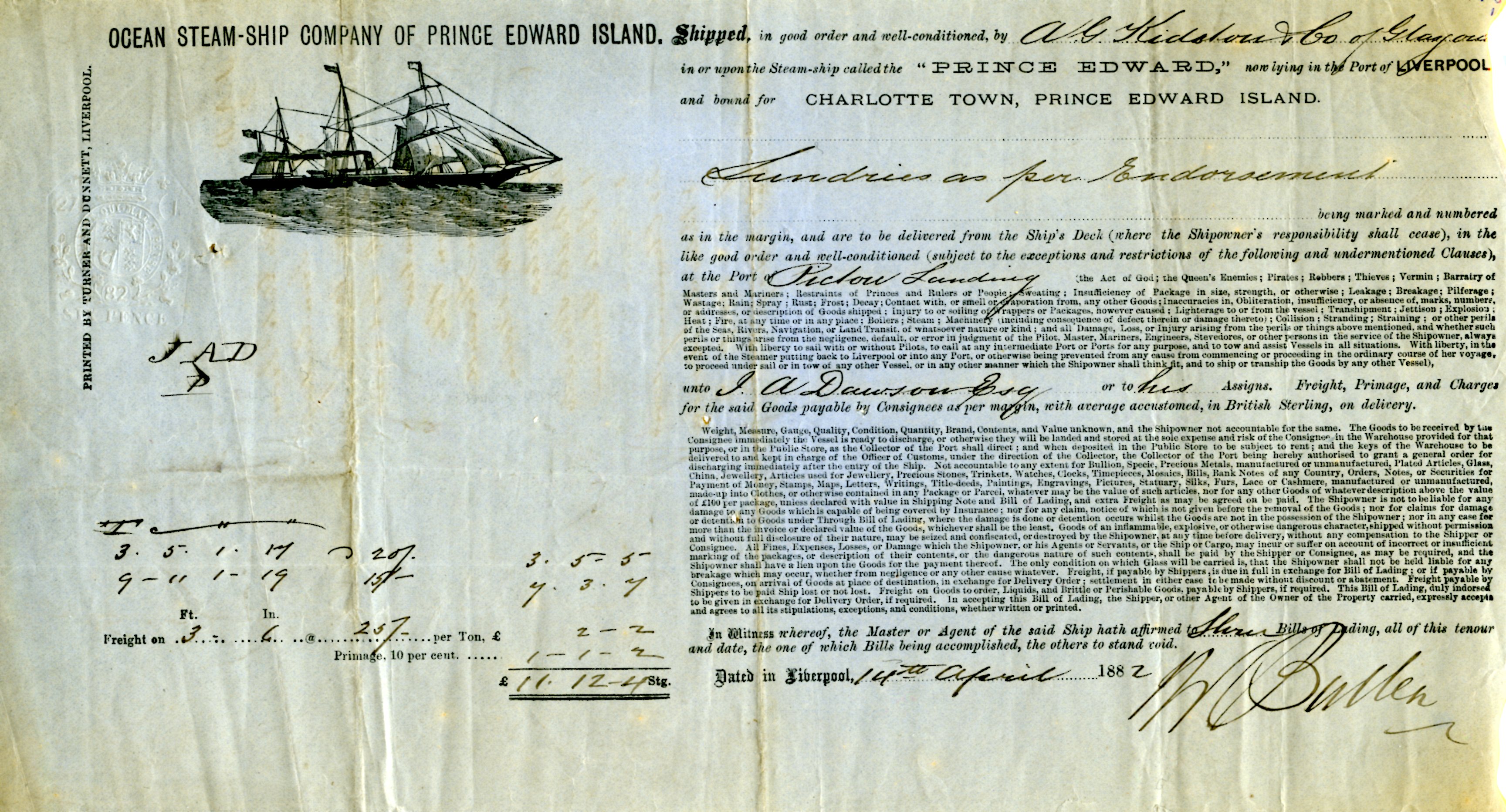 Shipment paper for J.A. Dawson, Esq., dated in Liverpool on the 14th of April, 1882.