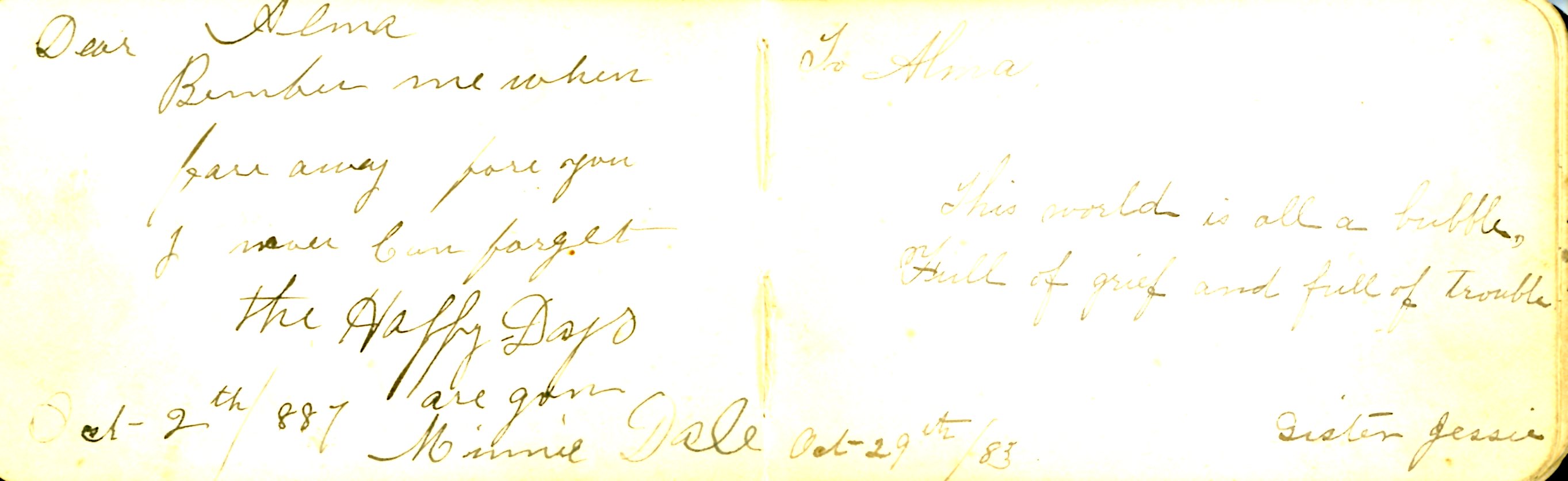 “Remember me when far away, for you I never can forget the happy days are gone.” -Minnie Dale, October 2nd, 1887