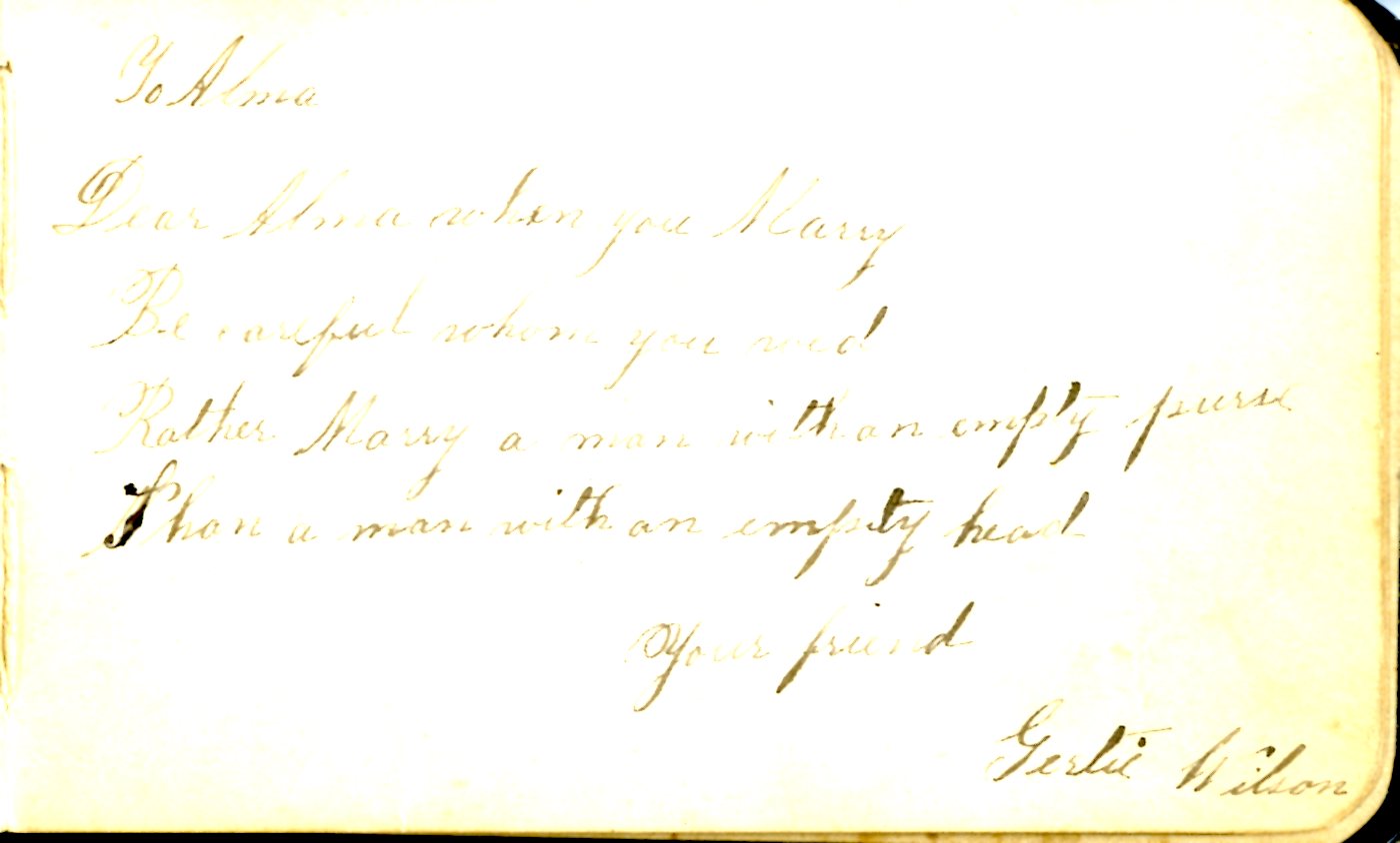 “Dear Alma when you may marry be carful who you wed, rather marry a man with an empty purse than a man with an empty head.”