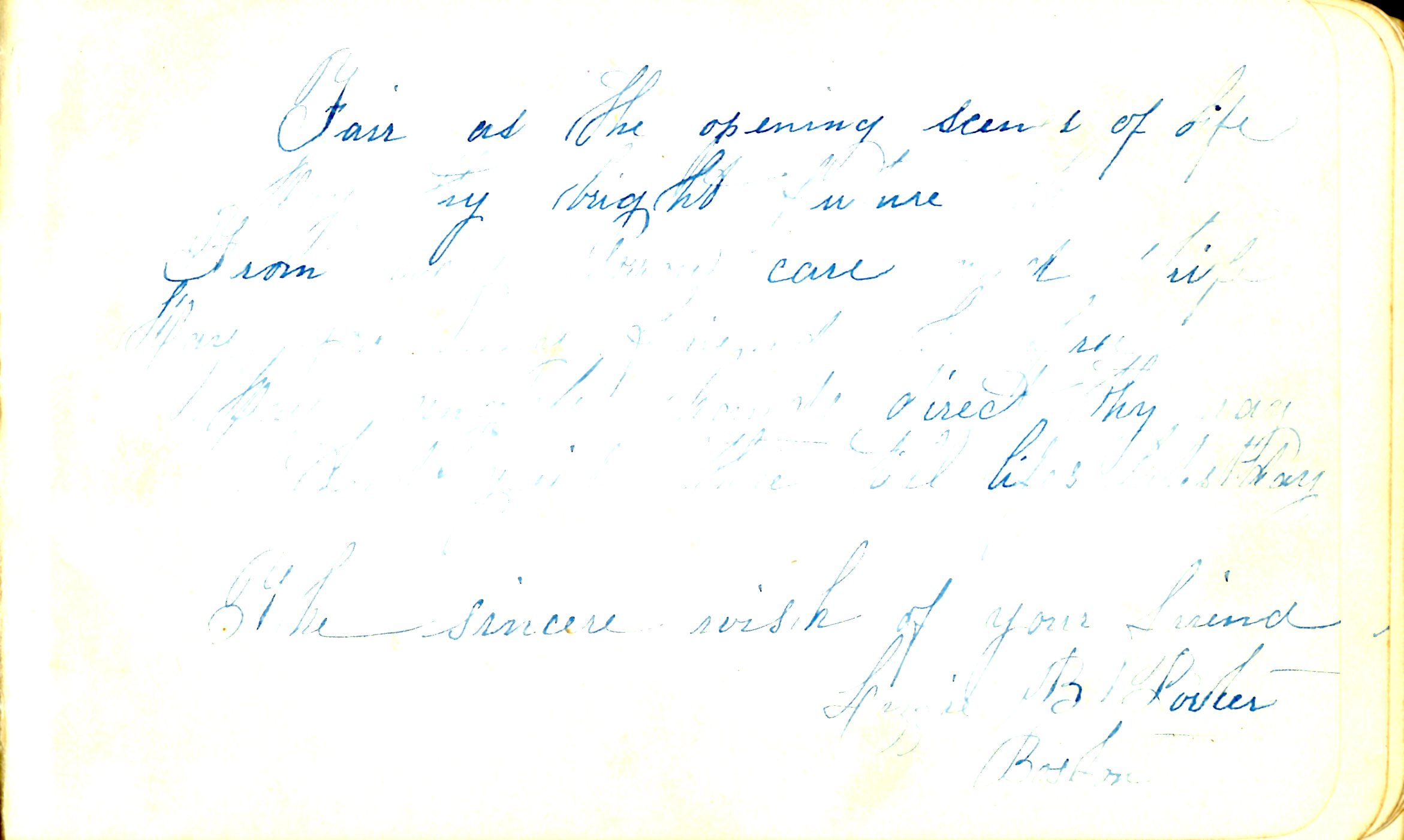 “Fair as the opening scenes of life, may thy heights future be from every _ care and _. May you my friend be free, may angels hands direct they way and guide thee till life’s latest day.”