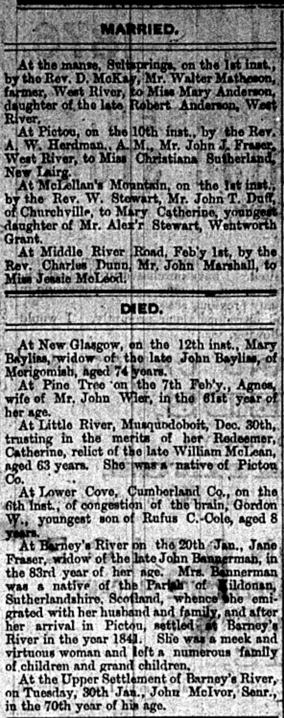 | Tags: | Walter Matheson, West River, Mary Anderson, John J Fraser, Christiana Sutherland, Pictou, New Lairg, MacLellans Mountain, John T Duff, Churchville, Mary Catherine Stewart, Alexander Stewart, Wentworth Grant, Middle River Road, John Marshall, Jessie McLeod, Mary Baylias, Merigomish, Pine Tree, Agnes Wier, Catherine McLean, Little River, Lower Cove, Cumberland County, Gordon W Cole, Rufus C Cole, Barney's River, Jane Fraser, John Bannerman, Upper Settlement, John McIvor |