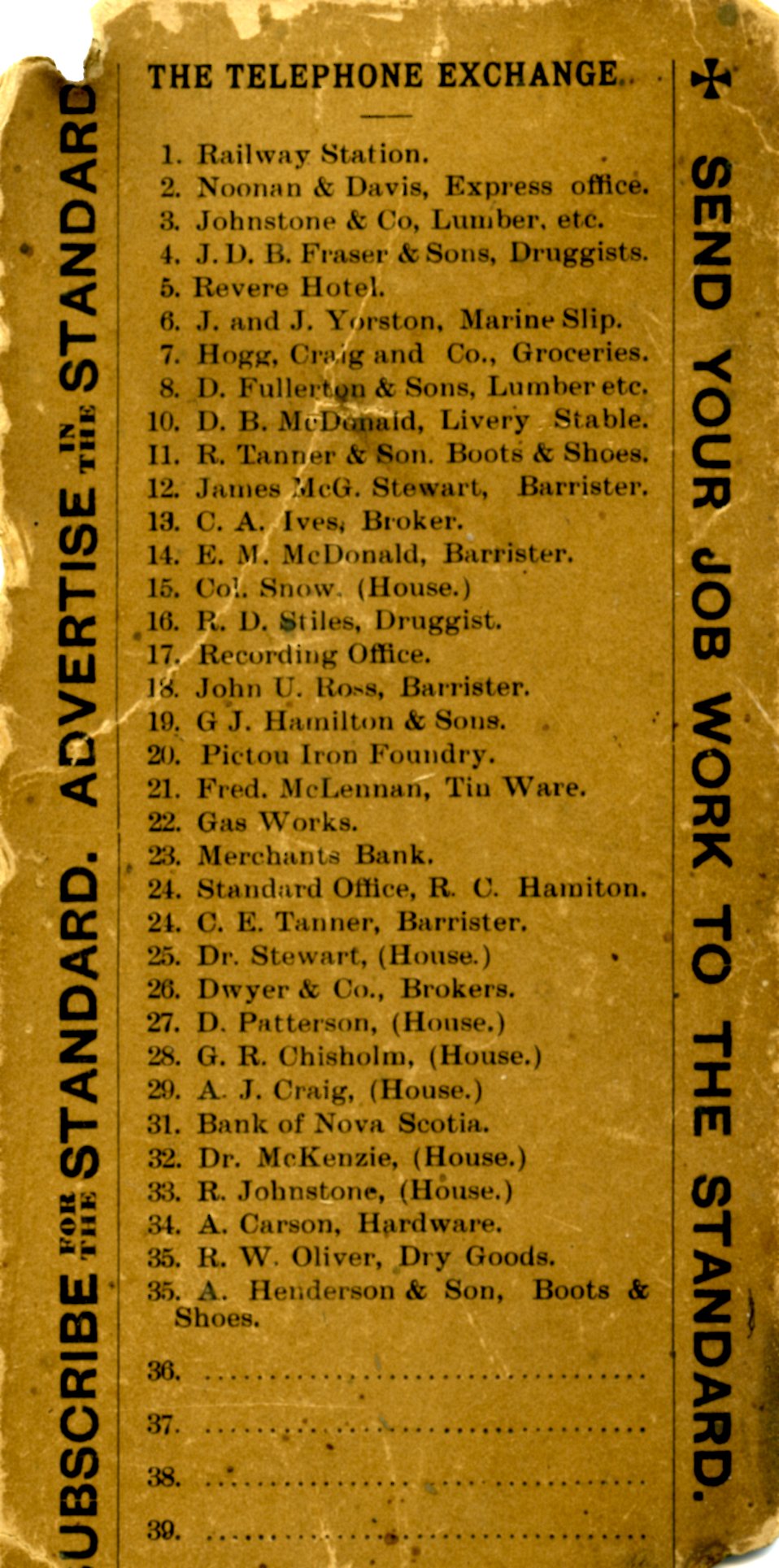Telephone directory for stores, companies, and homes in the Pictou area from the later half of the 1800s.