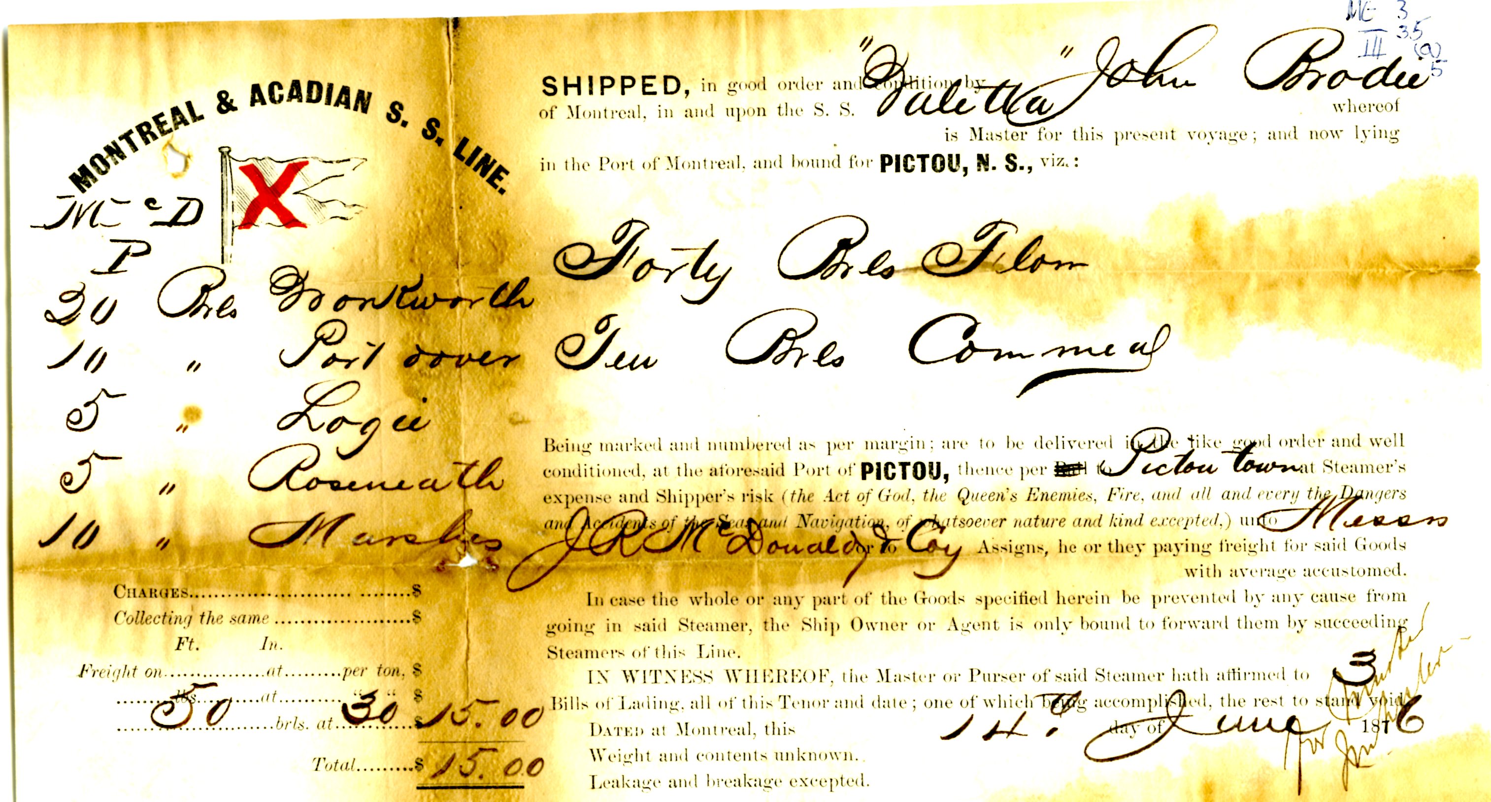 Bill of Lading, dated 14th June 1876 for John R. McDonald, Pictou, for a shipment of flour and cornmeal on the Valetta