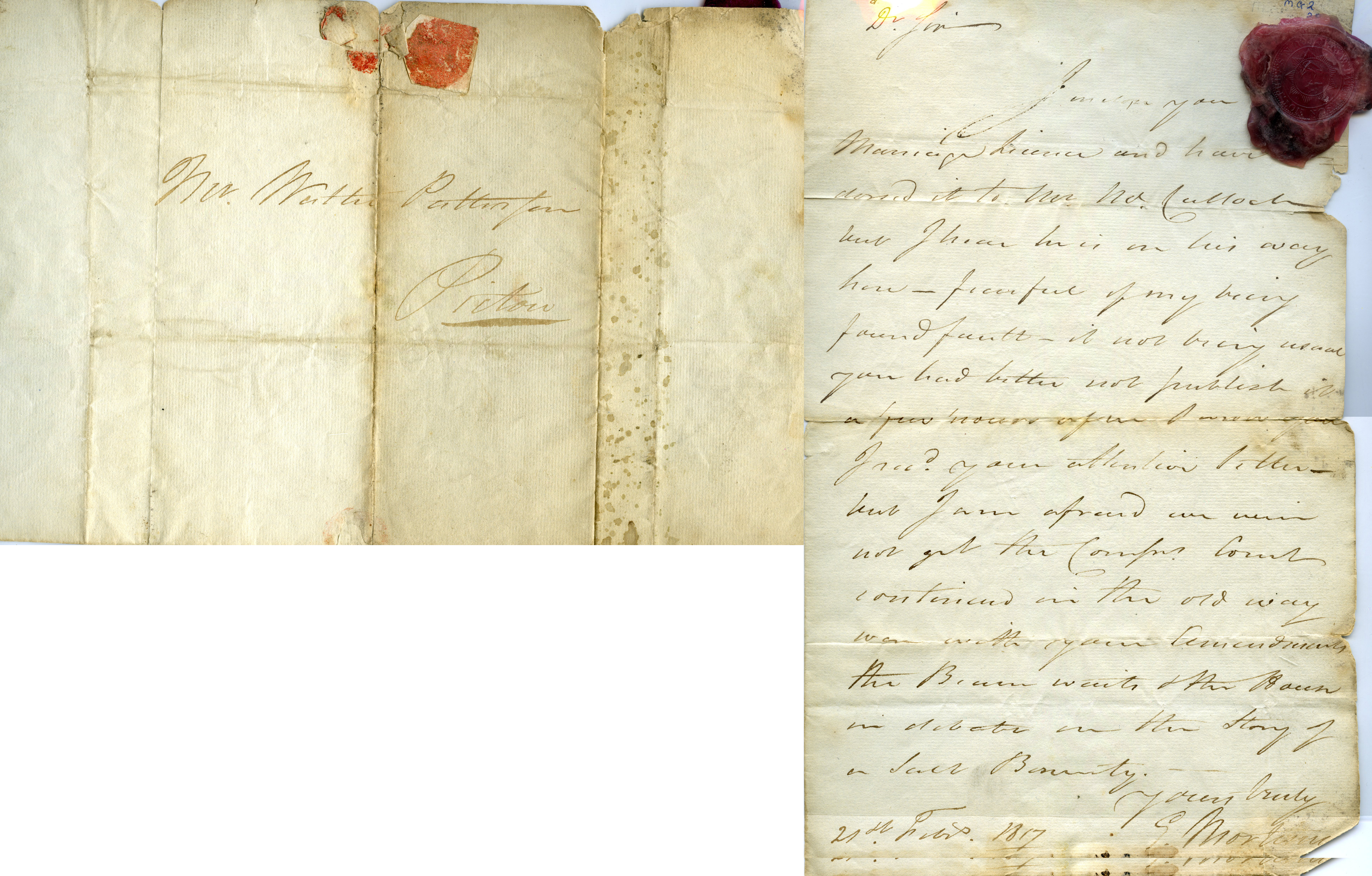 Letter explains how the marriage license for presumably Walter Patterson was given to Mr. McCulloch by Edward Mortimer in 1817.