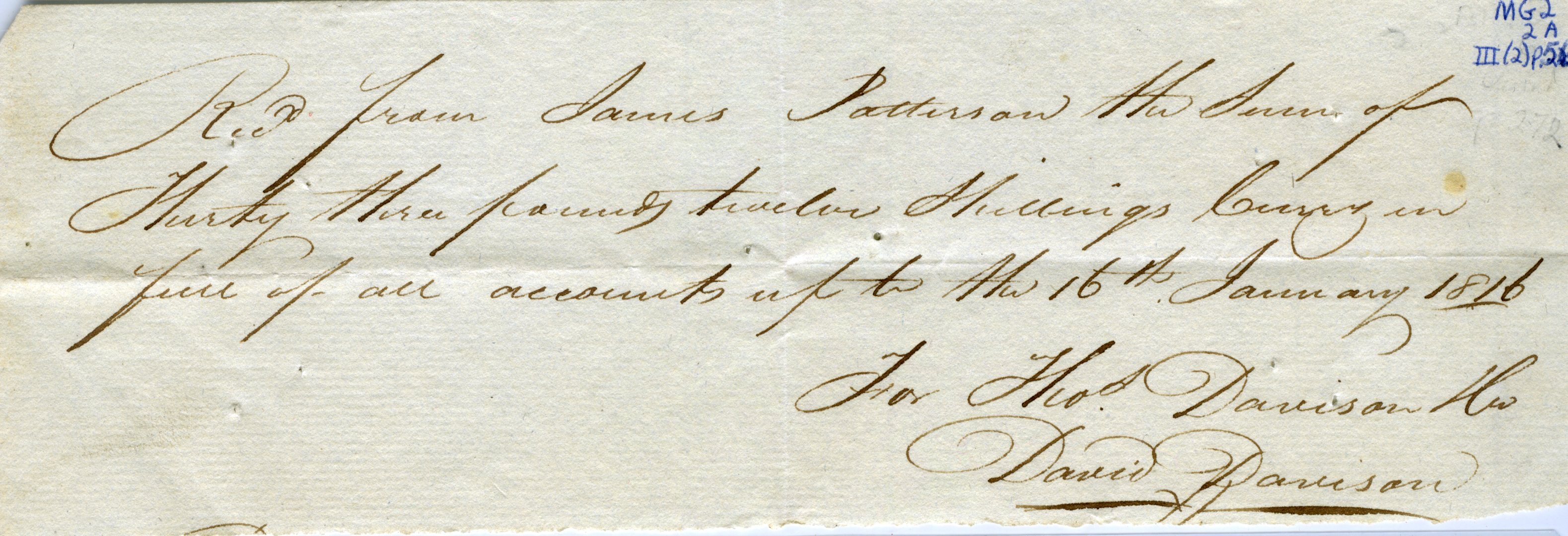 | Tags: | Patterson Papers, James Patterson, David Dawson, Thomas Dawson, receipt |