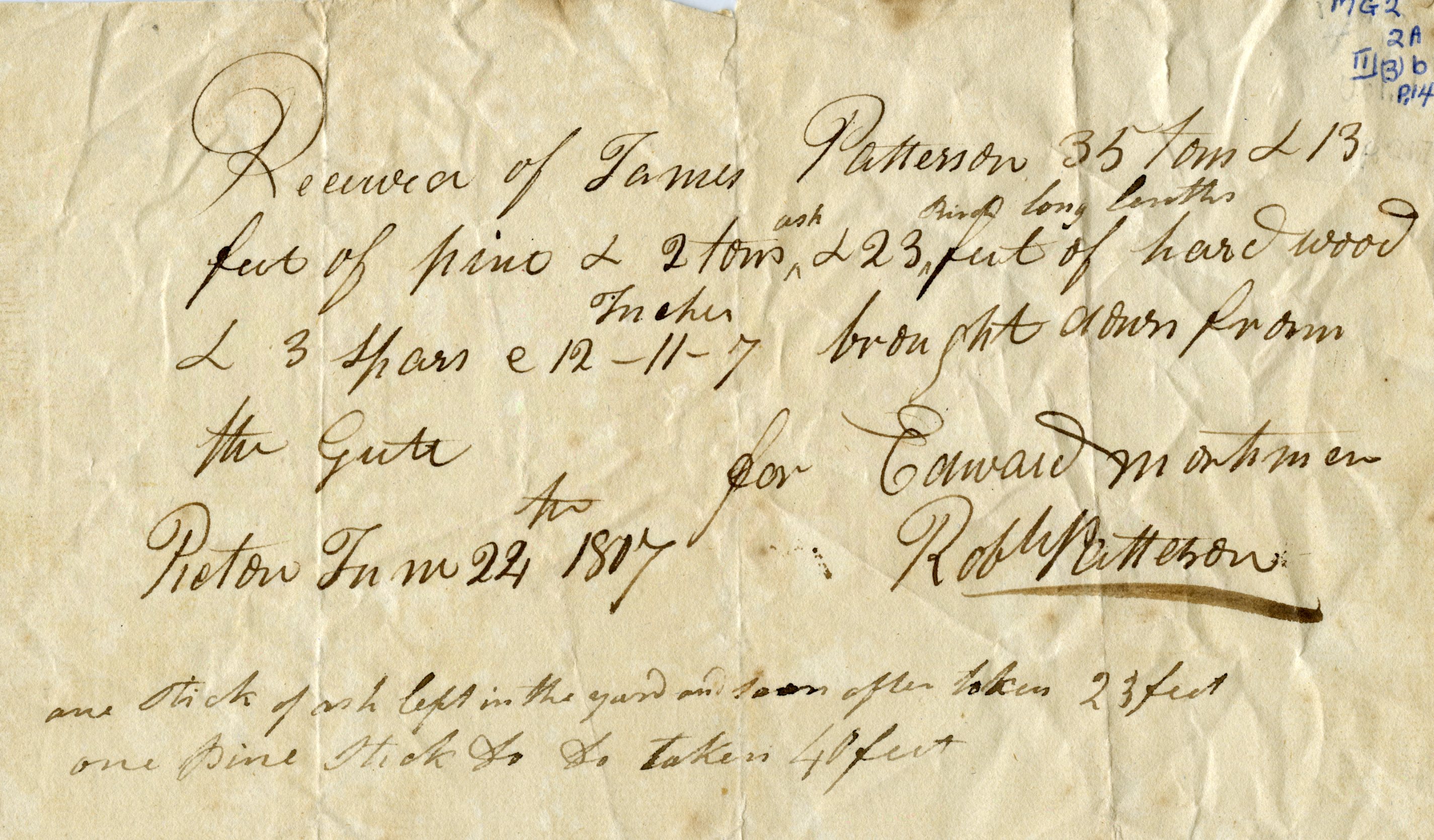 "Received of James Patterson 35 tons and 13 feet of pine and 2 tons ash and 23 feet long of hardwood and 3 spars of 12-11-7 timber brought and own from the Gute. Pictou [June?] 24, 1807, for Edward Mortimer and Robert Patterson."