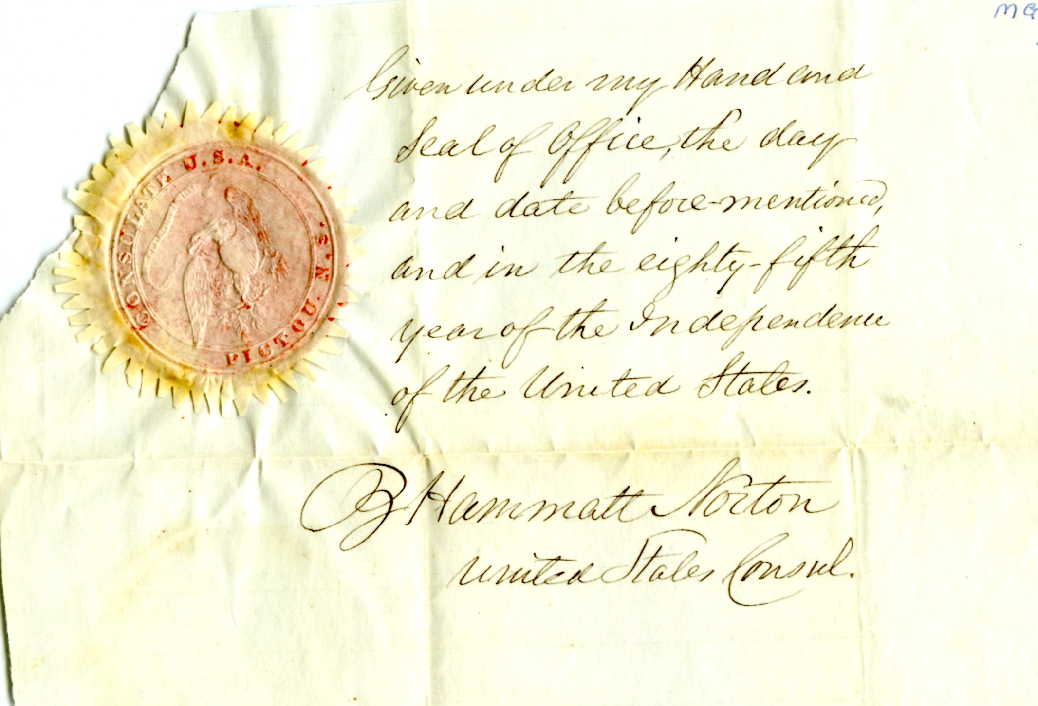 "Given under my hand and Seal of Office, the day and date before mentioned, and in the eighty-fifth year of the independence of the United States.