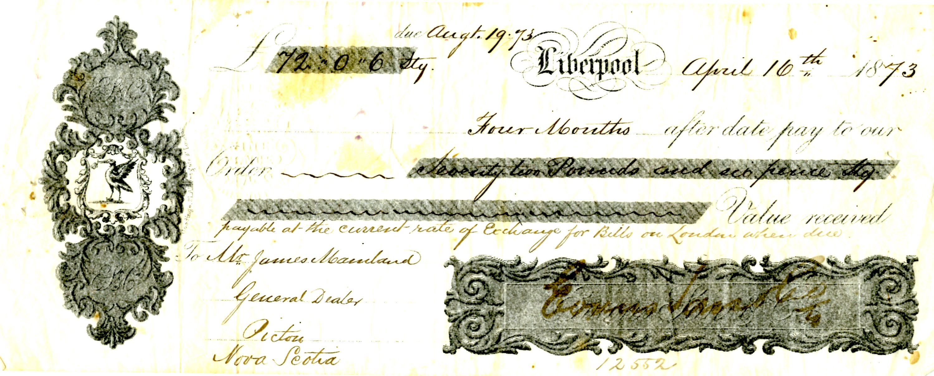 Four months after date pay to our order_____Seventy two pounds and six pence stg. Value received payable at the current rate of exchange for bills on London where due.
