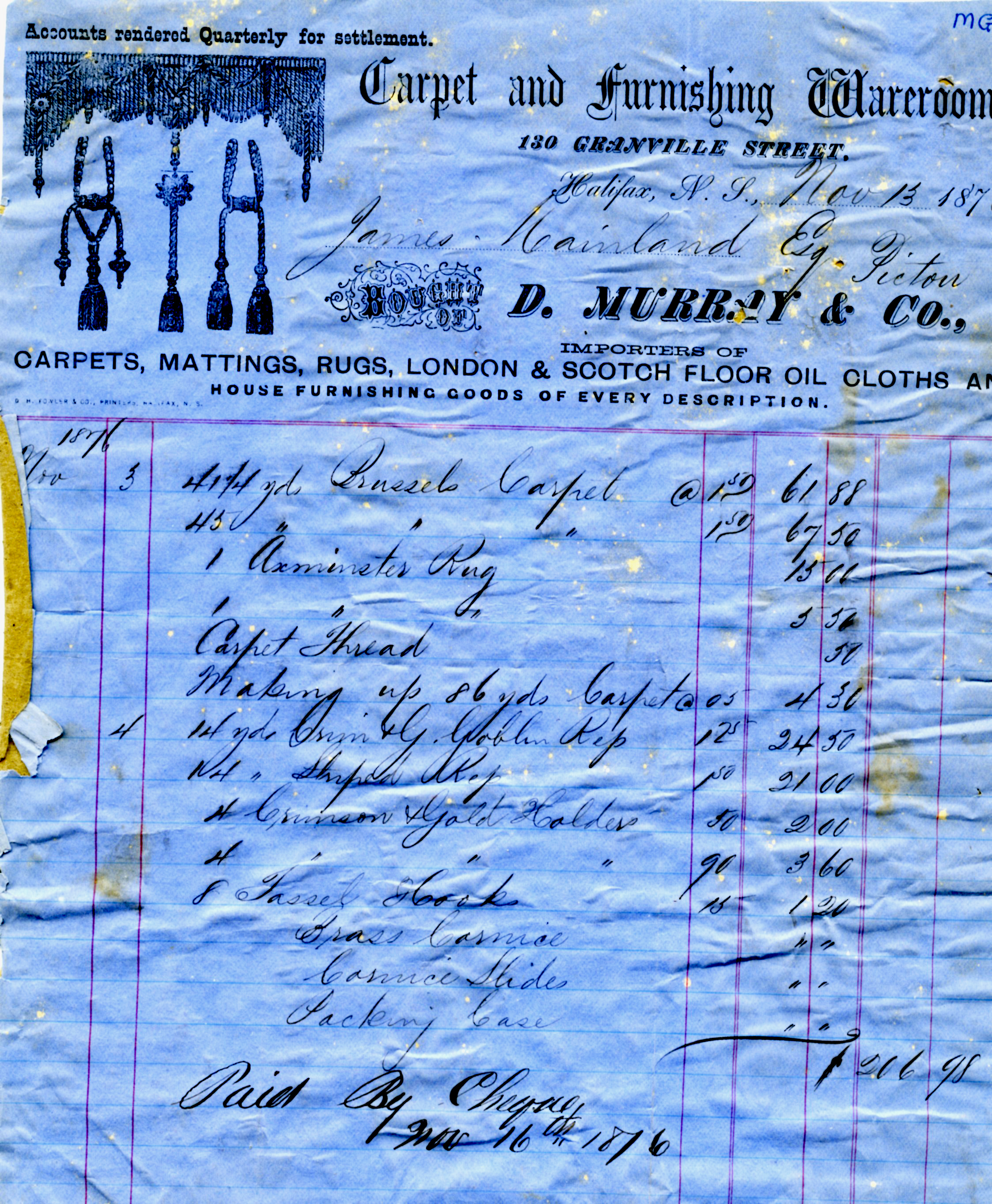 Invoice from D. Murray & Co.(Halifax, N.S.), importers of carpets, mattings, rugs, floor oil cloths, and house furnishing goods. Dated November 13th, 1876 for James Mainland, Pictou.