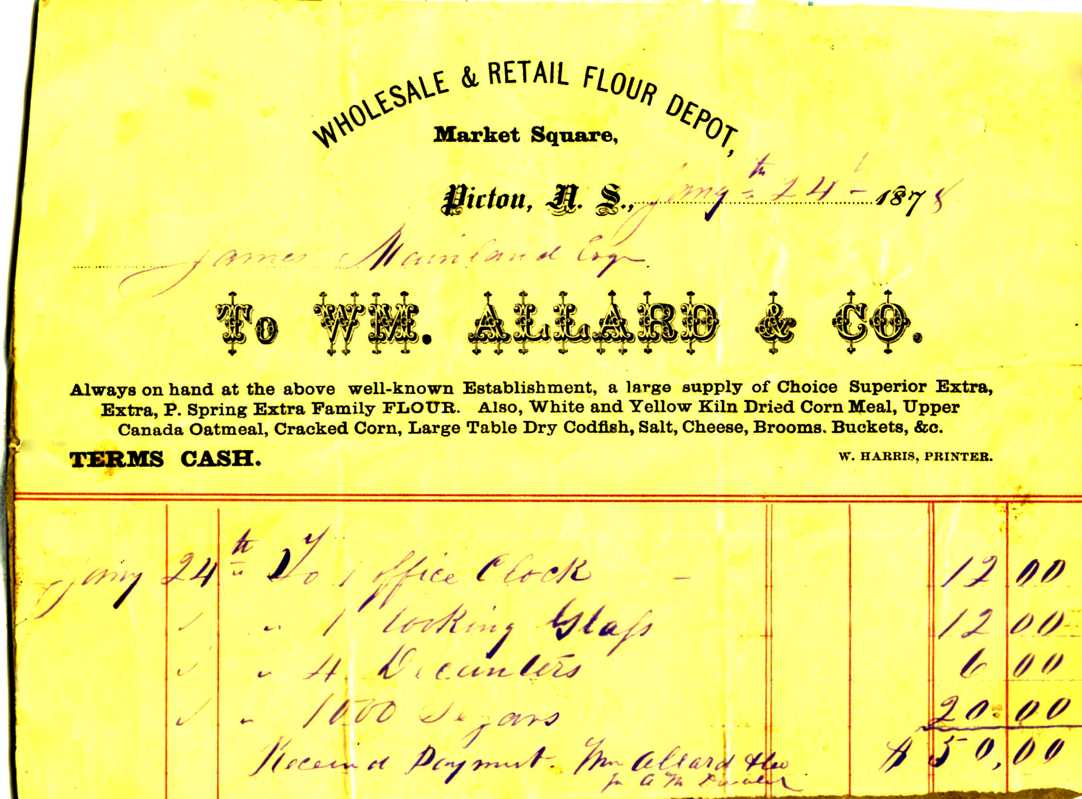 Invoice from William Allard & Co., wholesale & retail flour depot in Pictou. Given to James Mainland on January 24th, 1878.