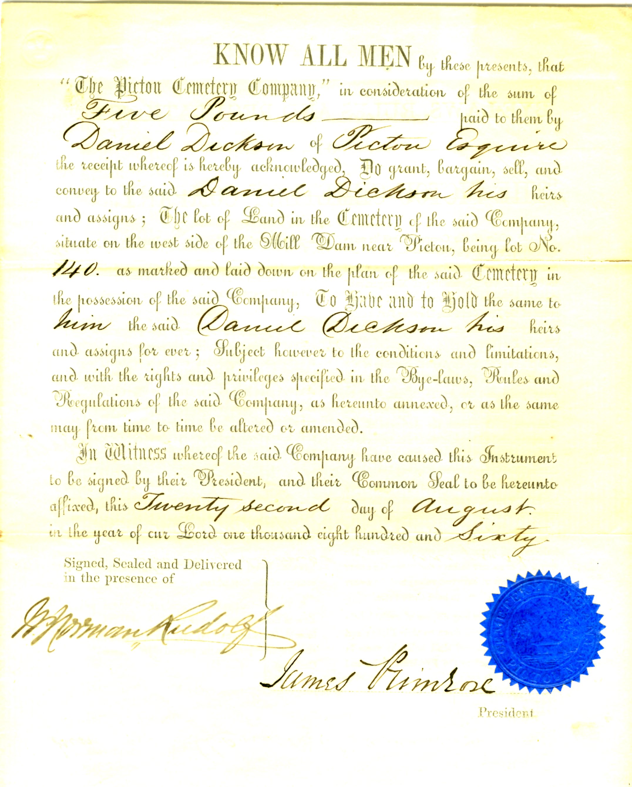 Agreement for cemetery land between the Pictou Cemetery Company, Daniel Dickson, and James Primrose