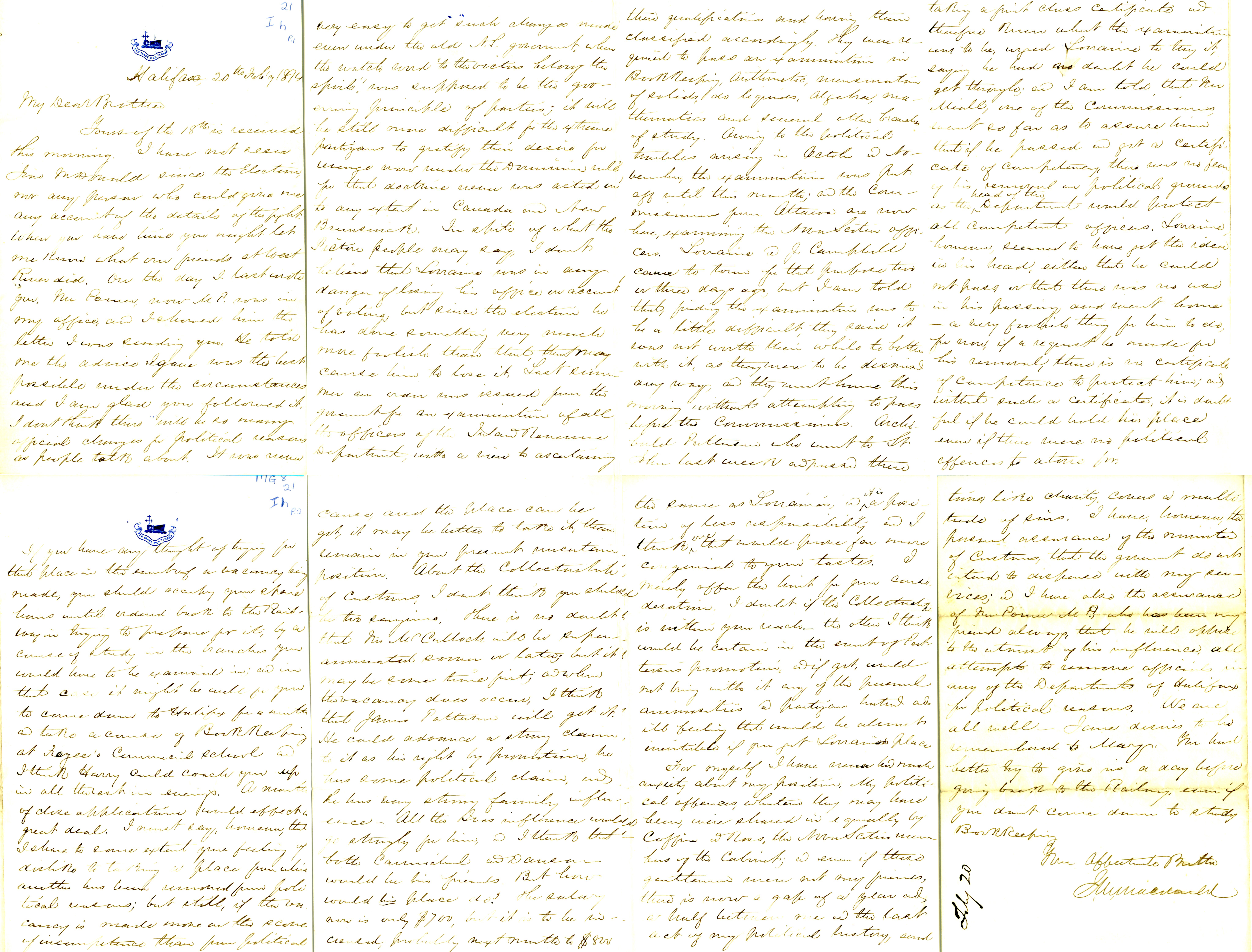 Written to John D. MacDonald from his brother, the letter describes the new certificates the Dominion is pushing onto its politicans. Lorraine, as the brother describes, has decided not to take the courses to get the certificate and therefore has lessen his chances of getting re-elected. The brother goes onto encourage John to take Lorraine's place in Nova Scotia politics.