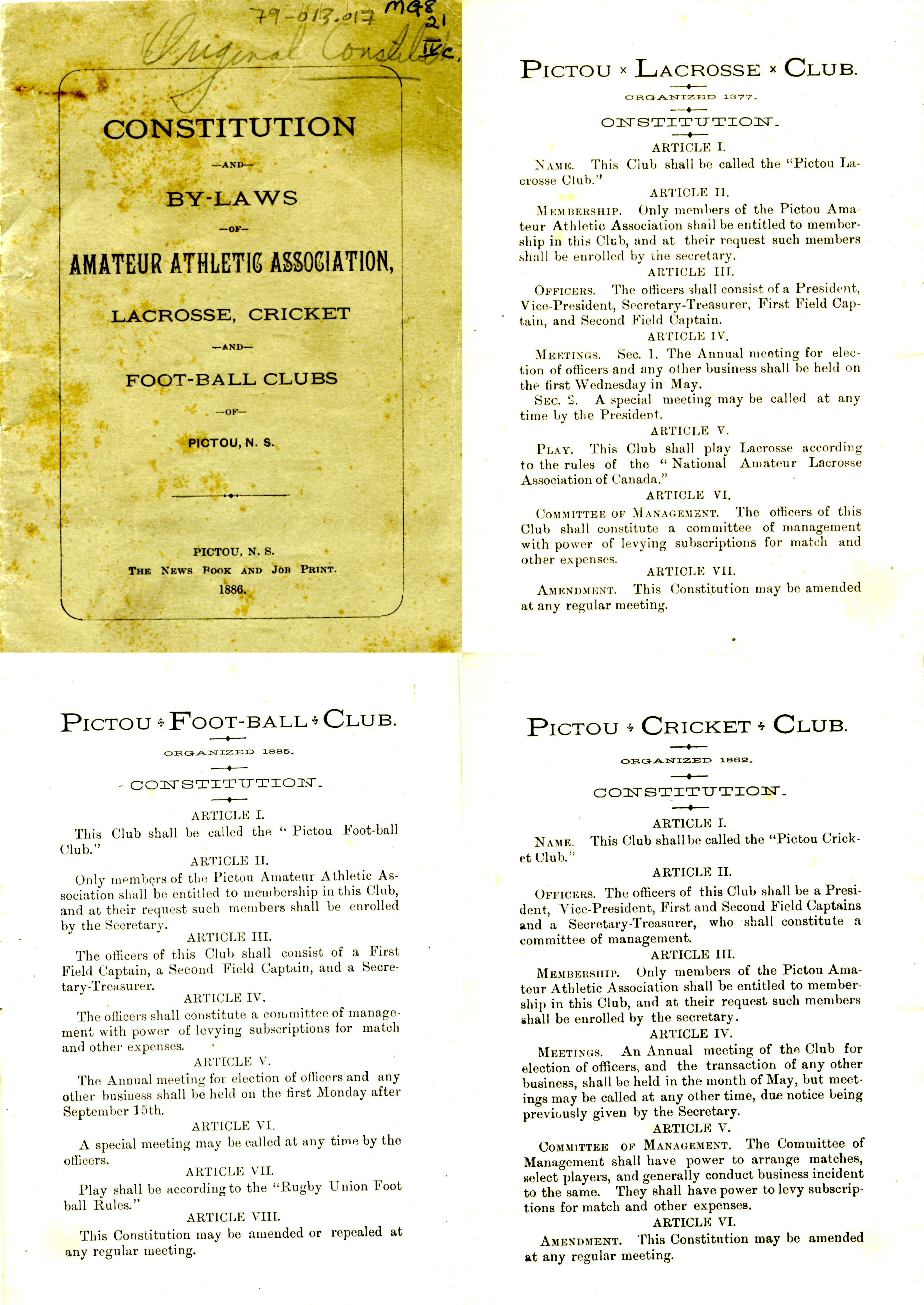 By-laws for three sports clubs in Pictou (lacrosse, football, and cricket). The rest of the ball details rules and regulations of the Amateur Athletic Association.