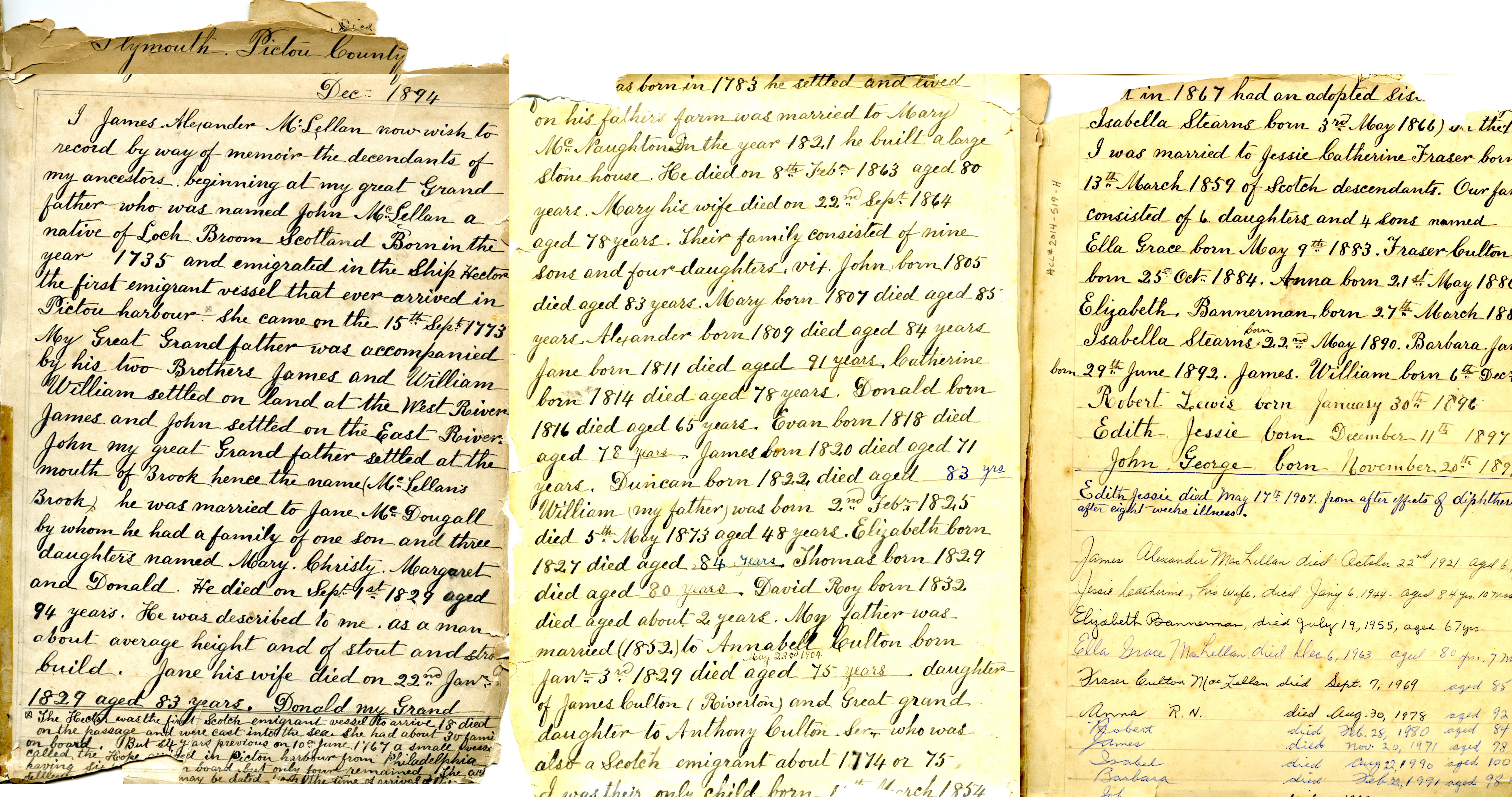 I James Alexander McLellan now wish to record by way of memoir the descendants of my ancestors beginning at my great-Grandfather who was named John McLellan a native of Loch Broom Scotland. Born in the year 1735 and emigrated in the Ship Hector the first emigrant vessel that ever arrived in Pictou harbour*. She came on the 15th Sept. 1773. My Great-Grandfather was accompanied by his two brothers James and William. William settled on land at the West River. James and John settled on the East River. John my great-Grandfather settled at the mouth of Brook hence the name McLellans Brook, he was married to Jane McDougall by whom he had a family of one son and three daughters named Mary, Christy, Margaret and Donald. He died on Sept. 1st, 1829 aged 94 years. He was described to me as a man about average height and of stout and strong build. Jane his wife died on 22nd January, 1829, aged 83 years. Donald my grandfather….was born in 1783, he settled and lived on his father’s farm was married to Mar McNaughton in the year 1821, he built a large stone house. He died on 8th Feb. 1863 aged 80 years. Mary his wife died on 22 Sept. 1864 aged 78 years. Their family consisted of nine sons and four daughters, [vit?] John, born 1805 died aged 83 years. Mary born 1807 died aged 85 years. Alexander born 1809 died aged 84 years. Jane born 1811 died aged 91 years. Catherine born 1814 died aged 78 years. Donald born 1816 died aged 65 years. Evan born 1818 died aged 78 years. James born 1820 died aged 71 years. Duncan born 1822, died aged 83 years. William (my father) was born 2nd Feb 1825 died 5th May 1873 aged 48 years. Elizabeth born 1827 died aged 84 years. Thomas born 1829 died aged 80 years. David Roy born 1832 died aged about 2 years. My father was married (1852) to Annabell Culton born Jan. 3, 1829 died May 23rd, 1904 aged 75 years, daughter of James Culton (Riverton) and great-granddaughter to Anthony Culton {Ser.] who was also a Scotch emigrant about 1774 or 75. I was their only child born [17th?] March 1854…..in 1867 had ab adopted sister…Isabella Stearns born 3rd May 1866) on the 1882. I was married to Jessie Catherine Fraser born 13th March 1859 of Scotch descendants. Our family consisted of 6 daughters and 4 sons named Ella Grace born May 9th 1883. Fraser Culton born 25th Oct. 1884. Anna born 21st May 1886. Elizabeth Bannerman, born 27th March 1888. Isabella Stearns born 22nd May 1890. Barbara Jane born 29th June 1892. James William born 6th Dec. 1893. Robert Lewis born January 30th 1896. Edith Jessie born December 11th 1897. John George born November 20th, 1899.