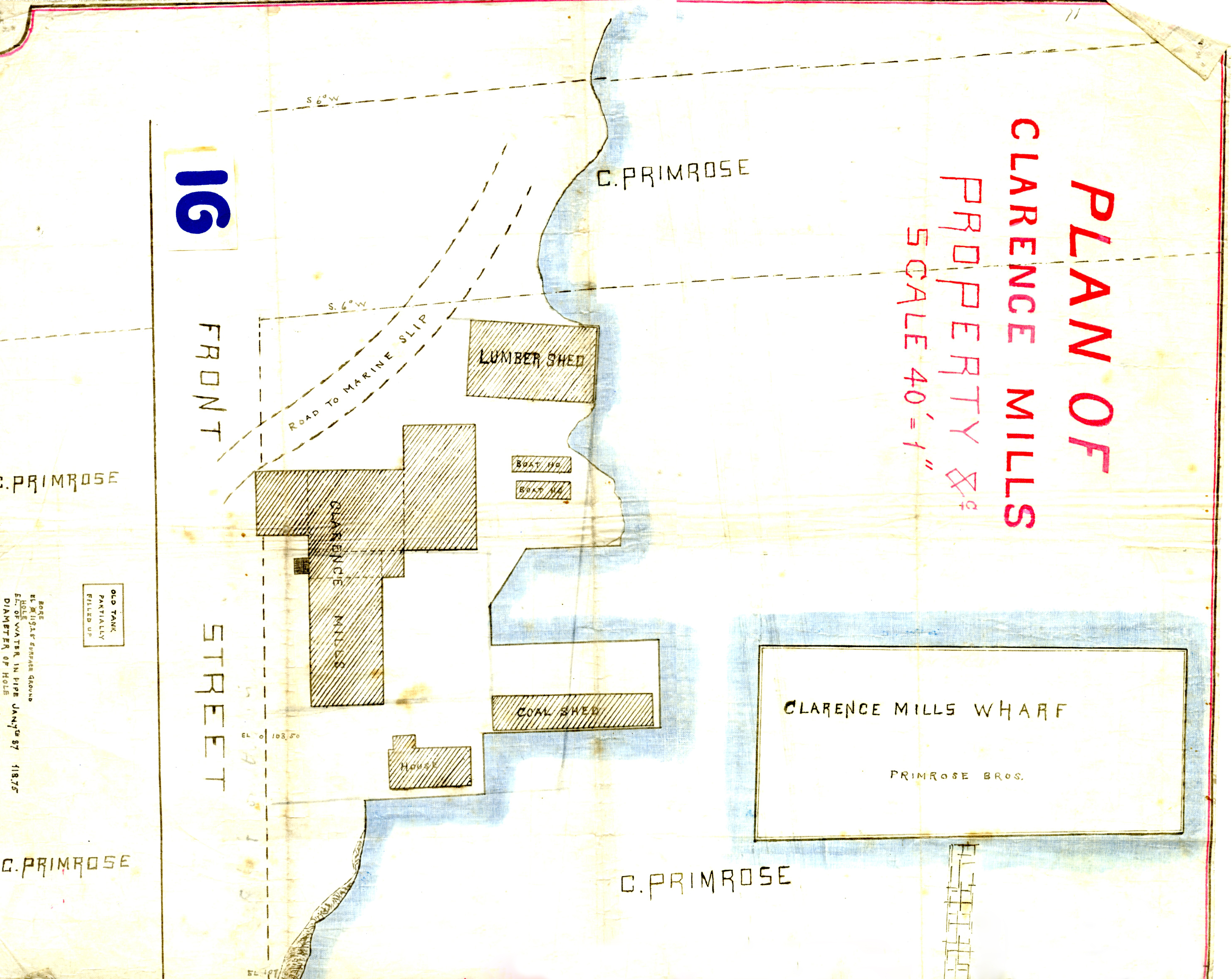 Plan outlining the mills along the wharf, with property belonging to C. Primrose marked.