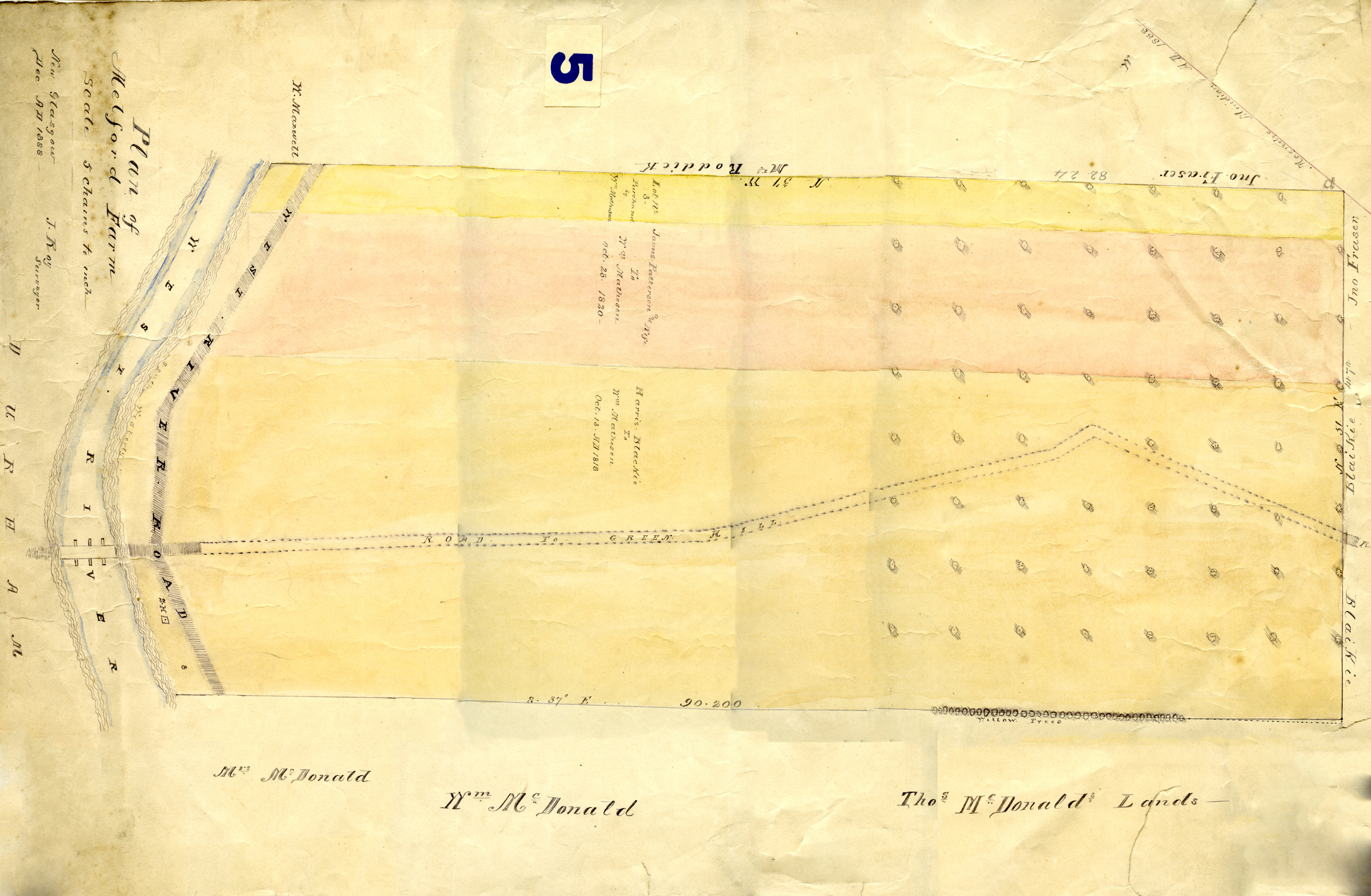 Map features the West River Road (east side) along the West River by the Durham bridge, along with the former road to Greenhill in the centre. William Matheson bought three plots of land (one from James Patterson and wife on Oct. 28, 1830, and one from Harris-Blackie on Oct. 13, 1818), which form to make the Melford farm lot. The lot borders thoses of Mrs. McDonald, William McDonald, and Thomas McDonald on the south; William Maxwell, Mrs. Roddick, and John Fraser on the north; John Fraser and Blaikie on the east; and the land of the school house and Durham Cemetery on the west.