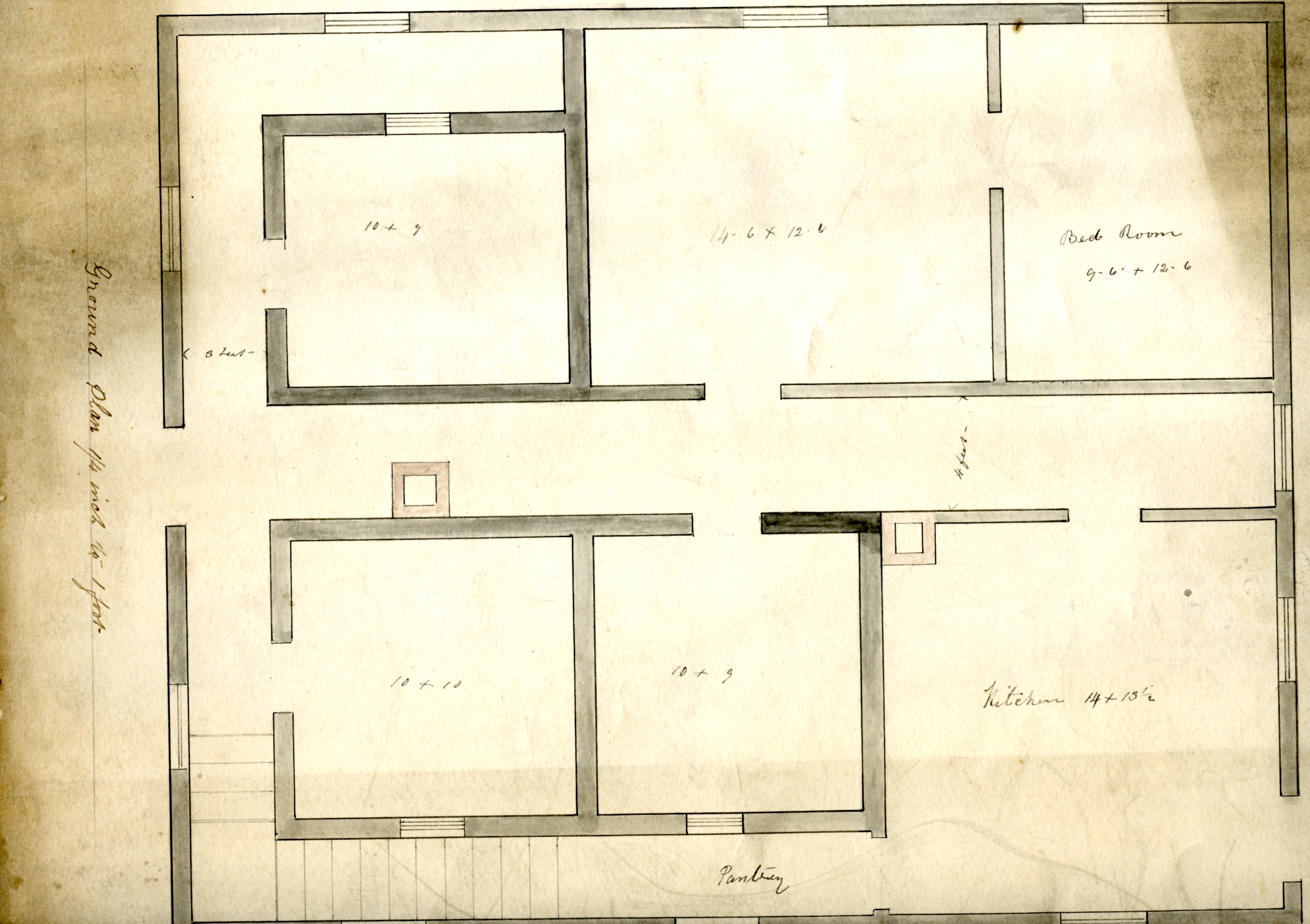 Seemingly plans for a house, with a kitchen, bedroom, and several larger rooms